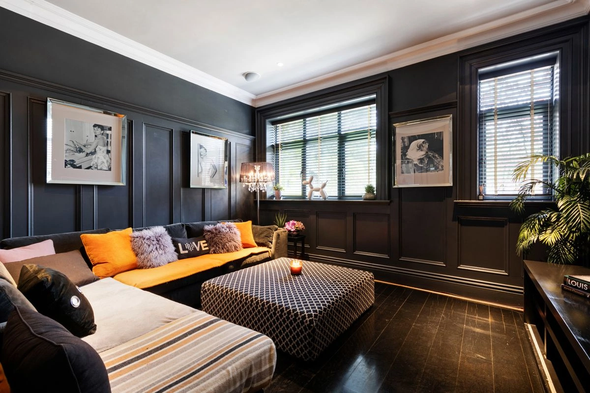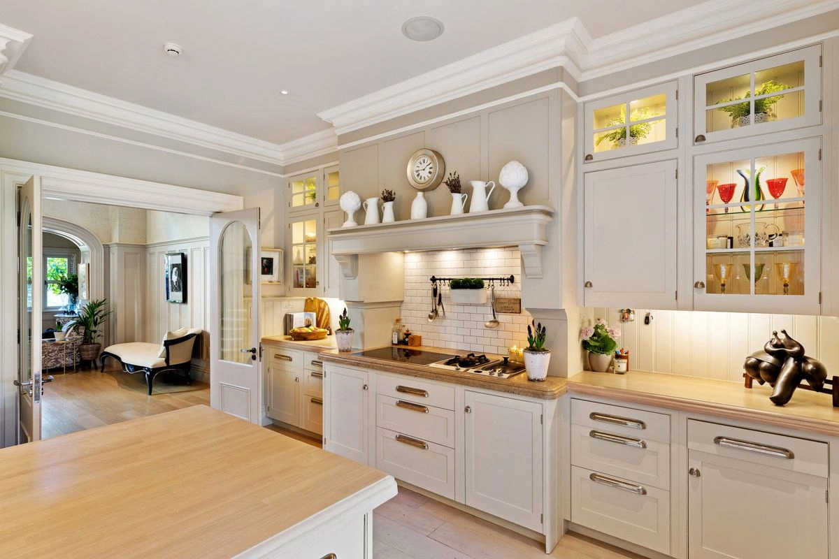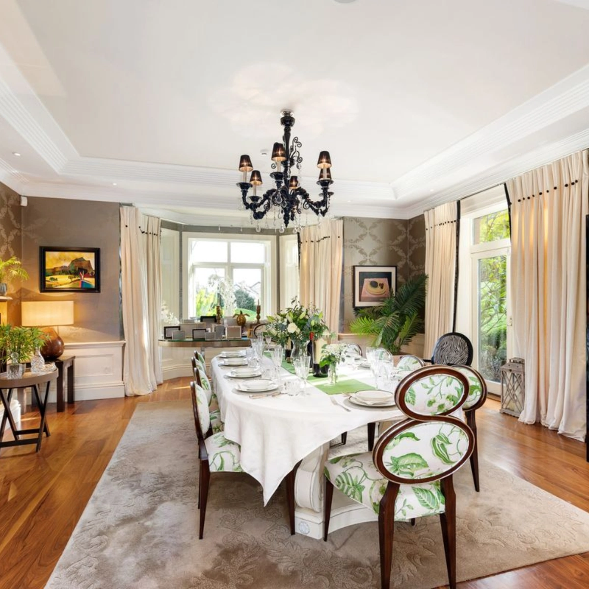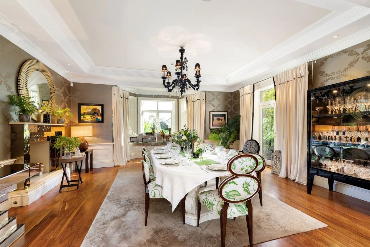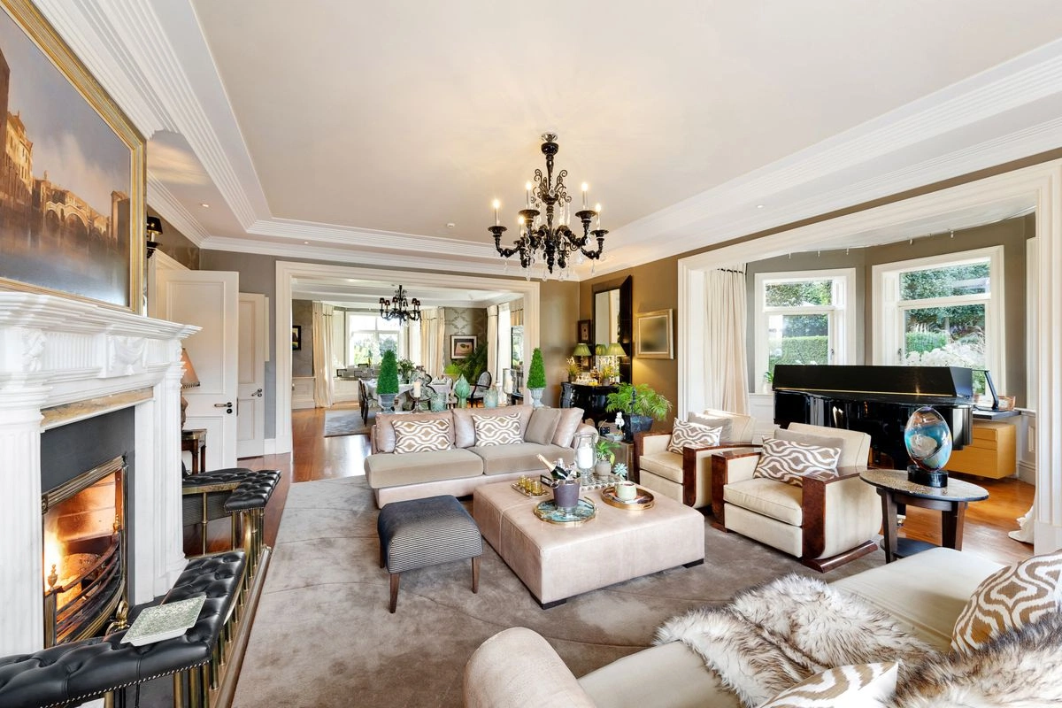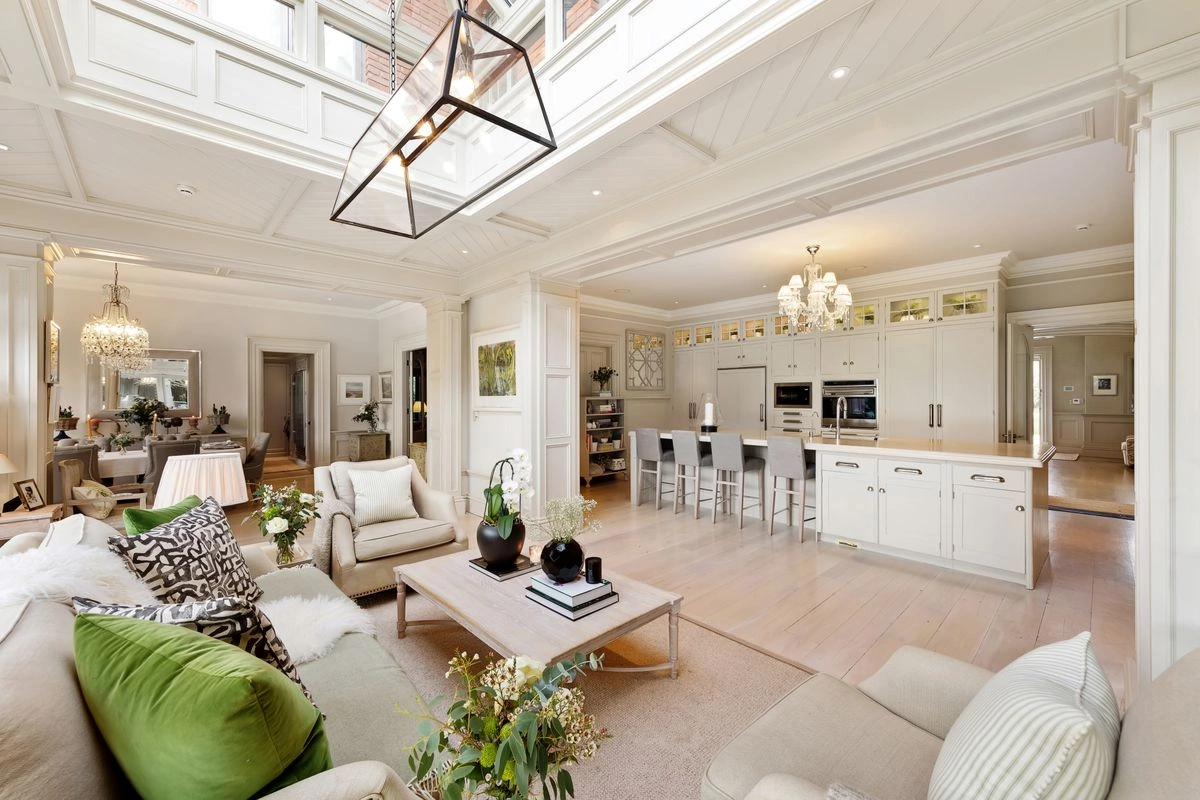 Off the hallway are two formal inter-connecting reception rooms with their own east and south-facing bay windows and south and west-facing French doors. Other standout features include Barovier e Toso Murano glass chandeliers and wall sconces, ornate fireplaces and tray ceilings.