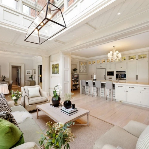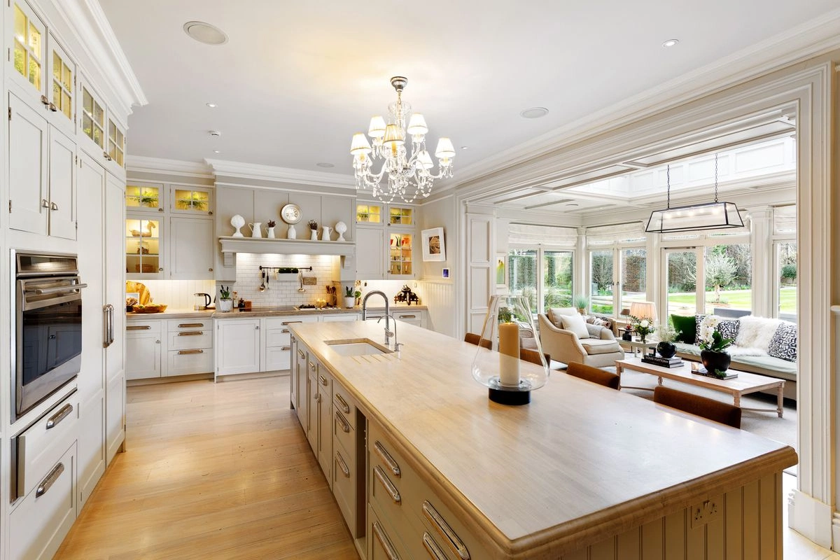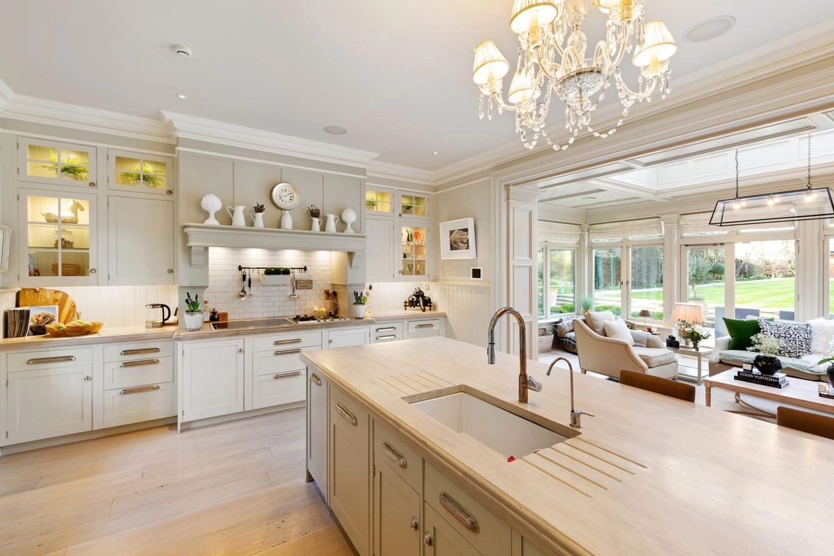 Further inside the home is the kitchen, hand-painted by Mark Wilkinson with a large centre island. This opens to the family room, a bright orangery with glazed lantern roof and a gorgeous view of the garden.