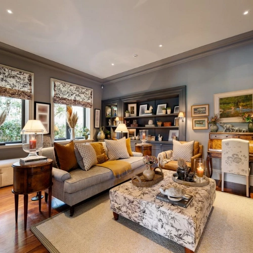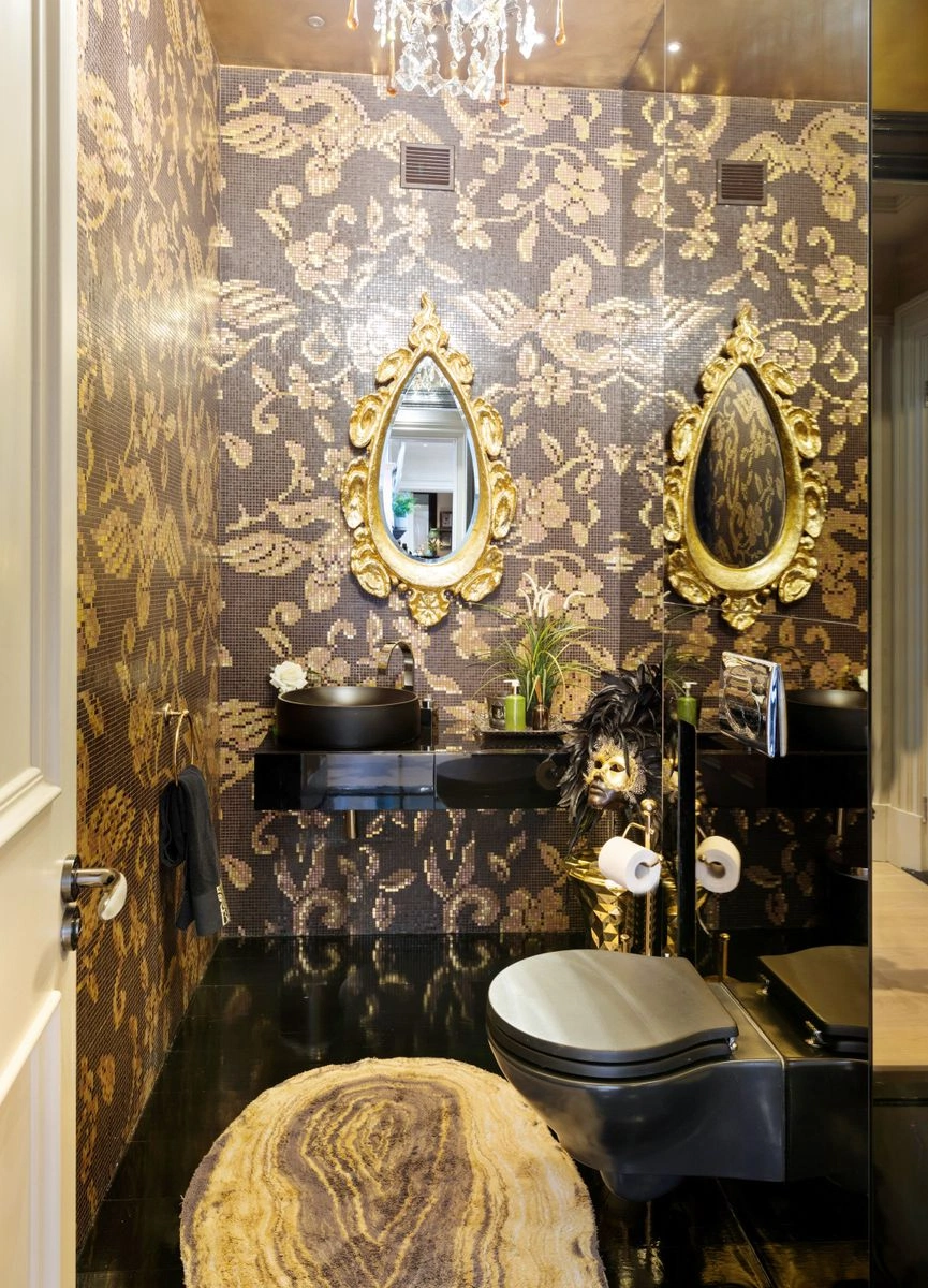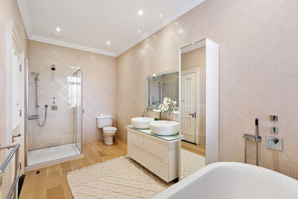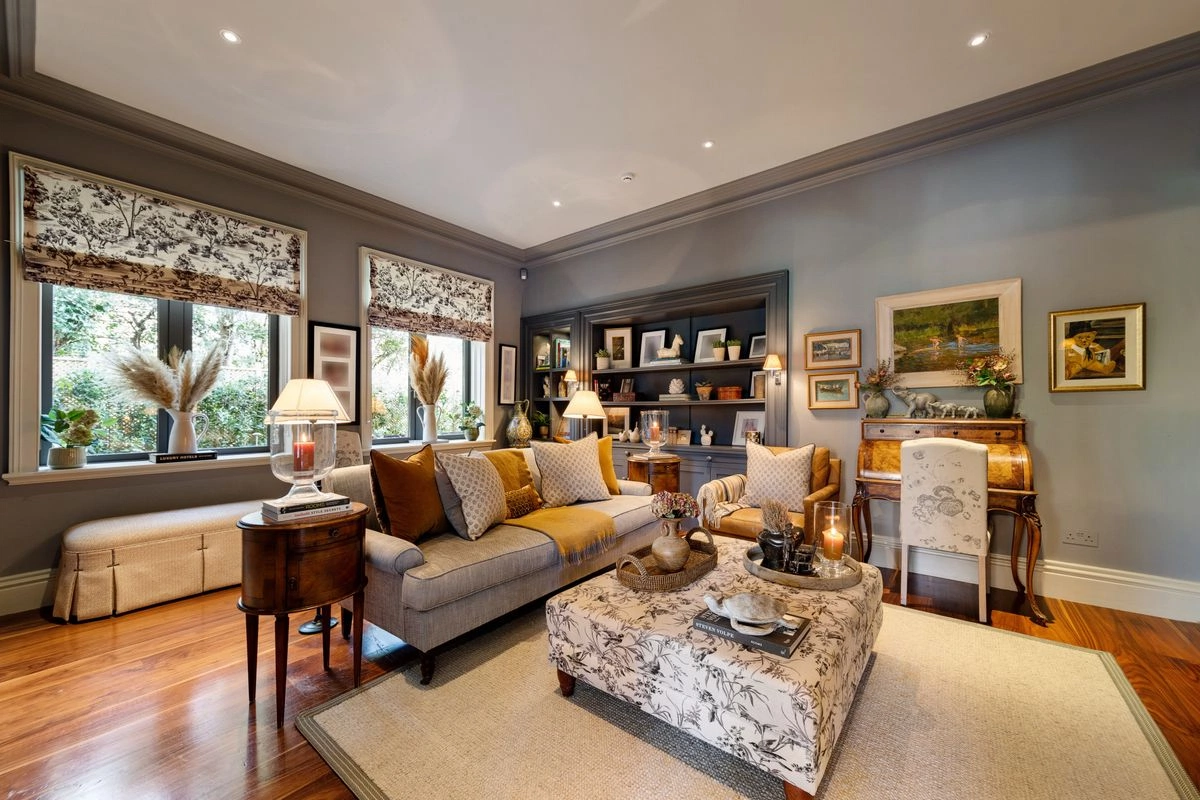 There is a utility and family toilet off this area with access to the side garden, along with a breakfast room and further living room. The formal guest toilet is located off the hallway with gorgeous Bisazza mosaic tiles and a hand-finished gold leaf ceiling.