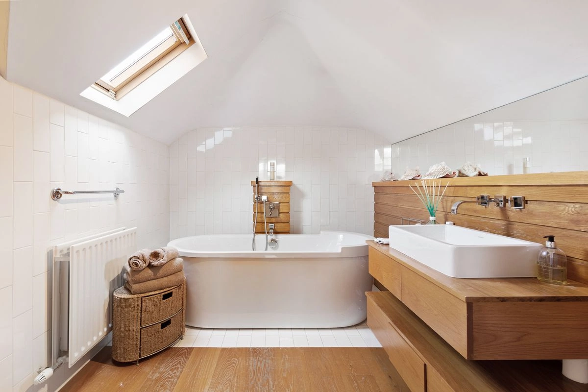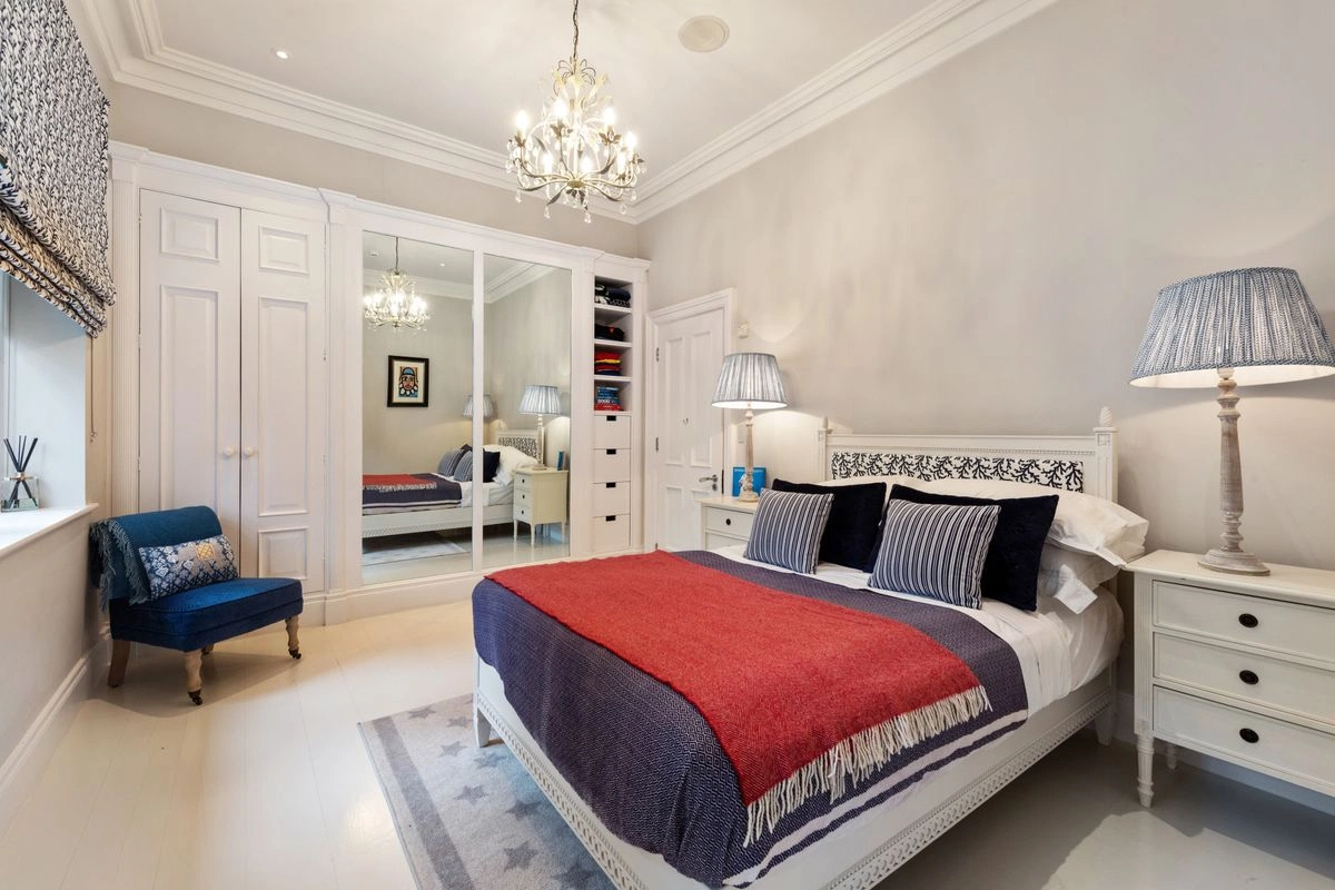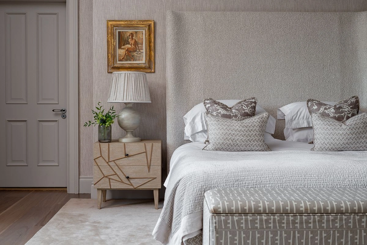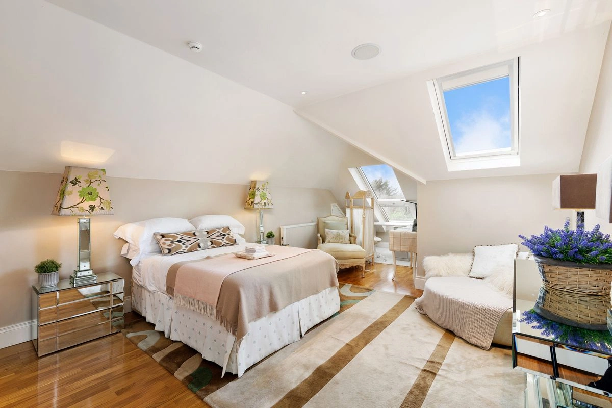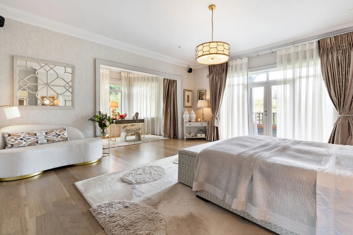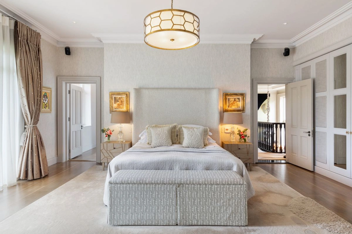 Back in the entrance hallway, a staircase with black handrails and treads leads up to the first floor. The main bedroom suite features generous wardrobe space in addition to a walk-in wardrobe and superb ensuite bathroom. West-facing French door open onto a balcony overlooking the garden to the rear.
