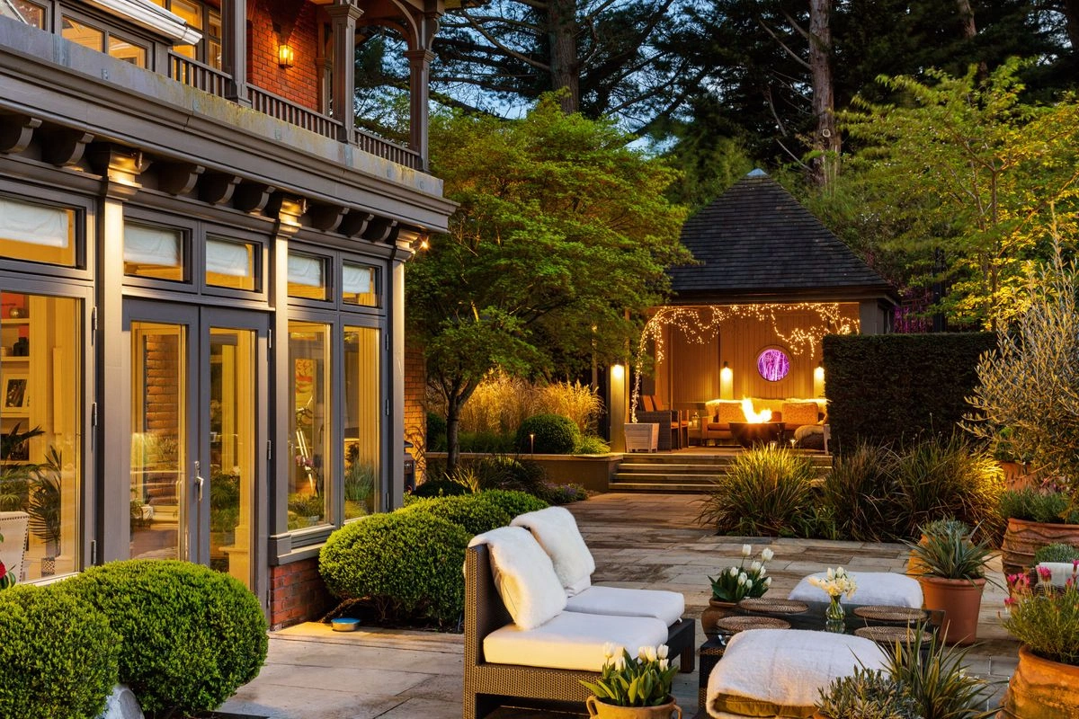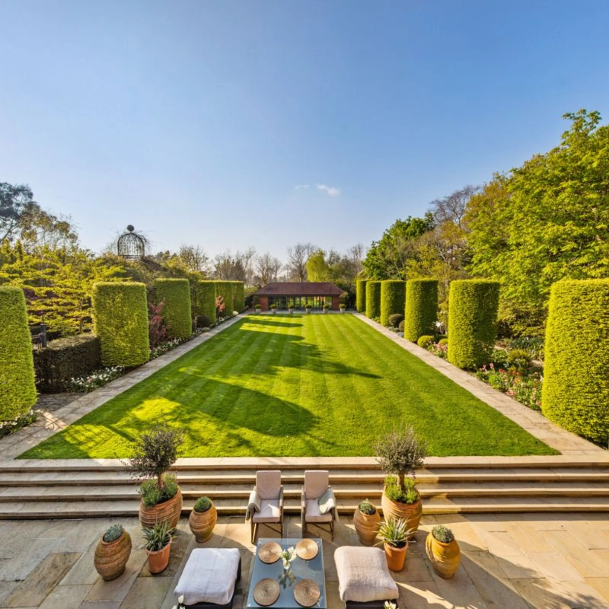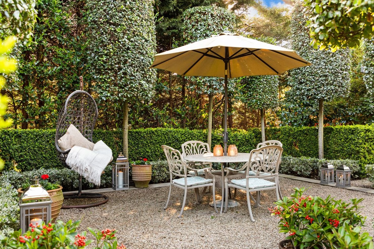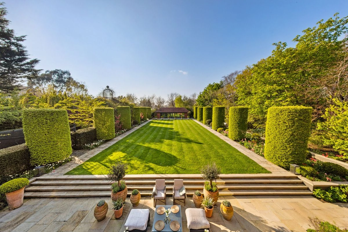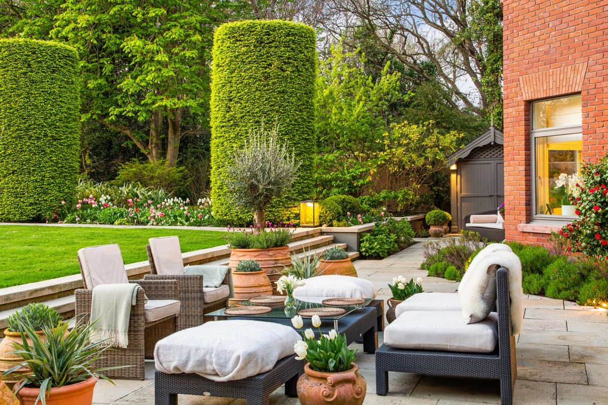 A small formal garden sits in a raised area, accessible from the French doors of the dining room.