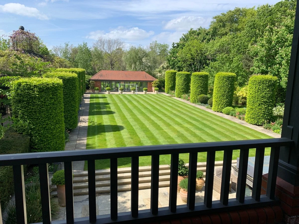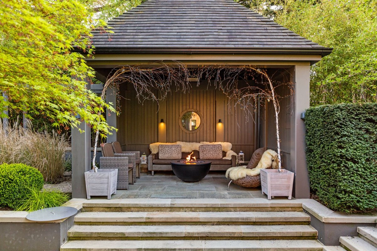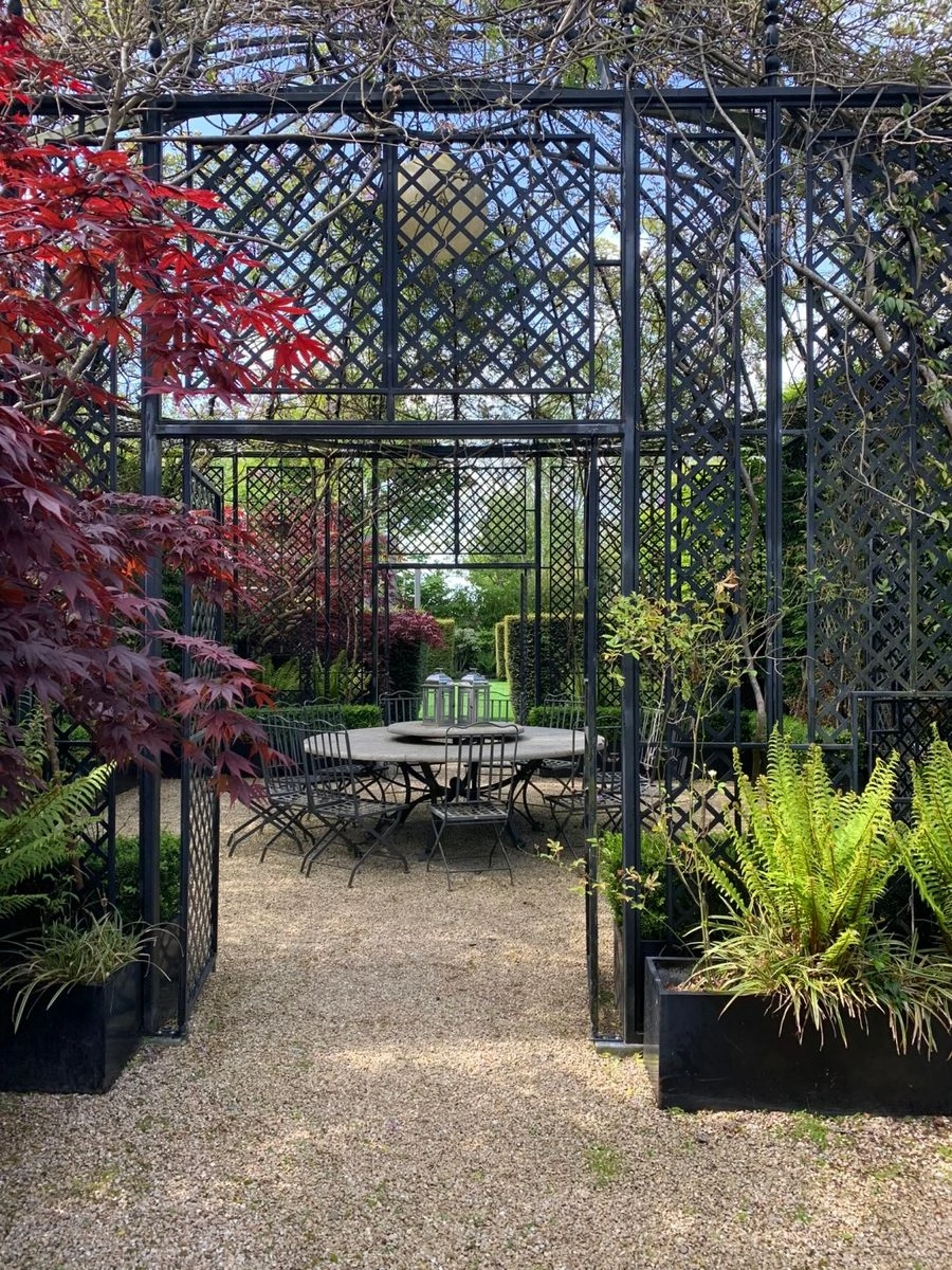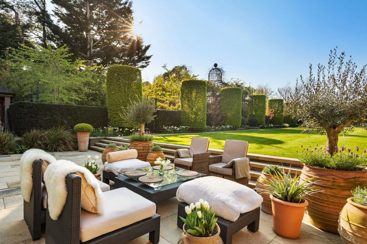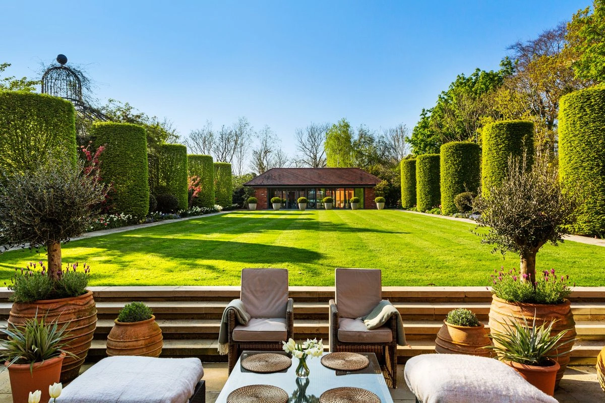 A small formal garden sits in a raised area, accessible from the French doors of the dining room.