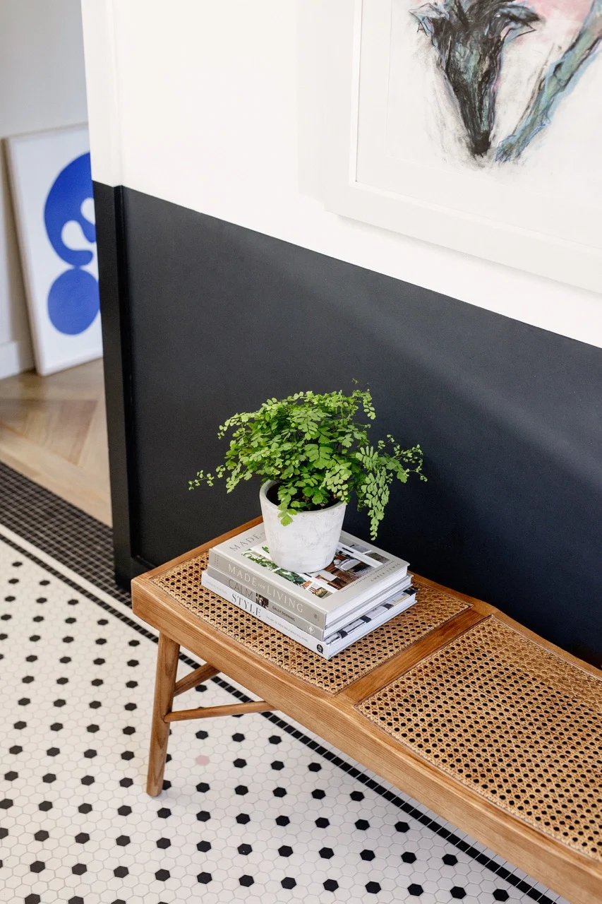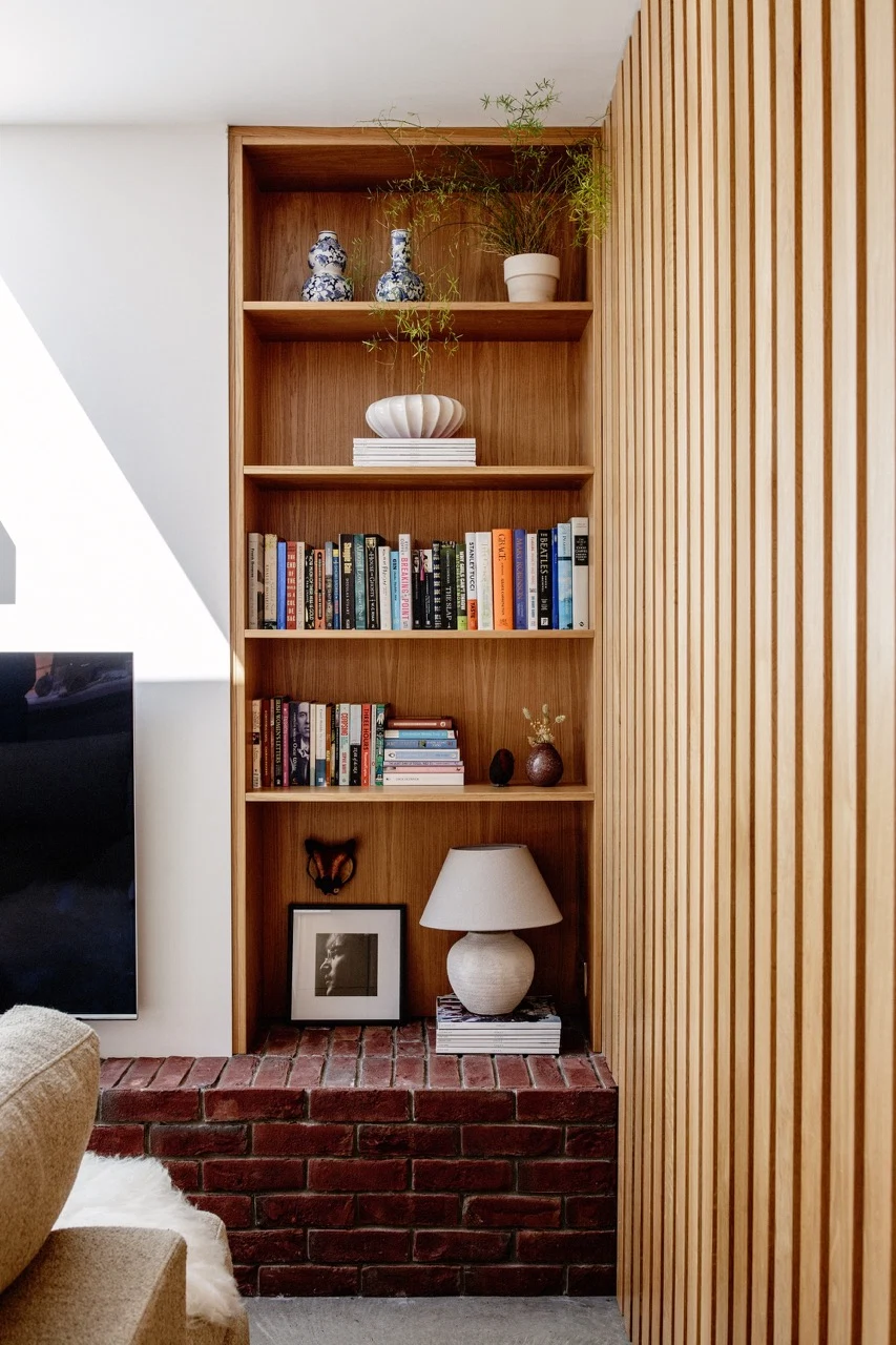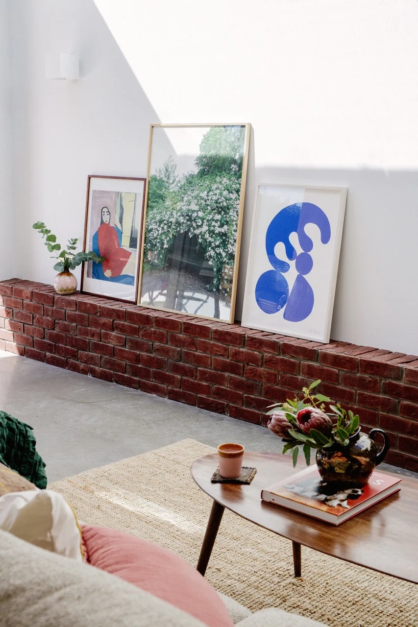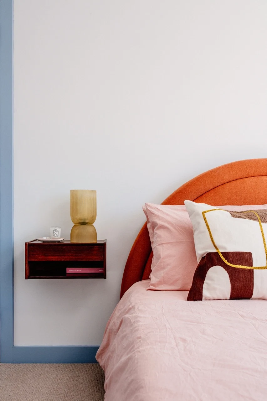 When Richie and Ciara were designing their home, they wanted the shapes and finishes to appear “monolithic”. Yet what’s interesting about this space is that it also feels warm and welcoming. Mid-century furniture finds and Scandinavian minimalism blend with joyous pops of colour.