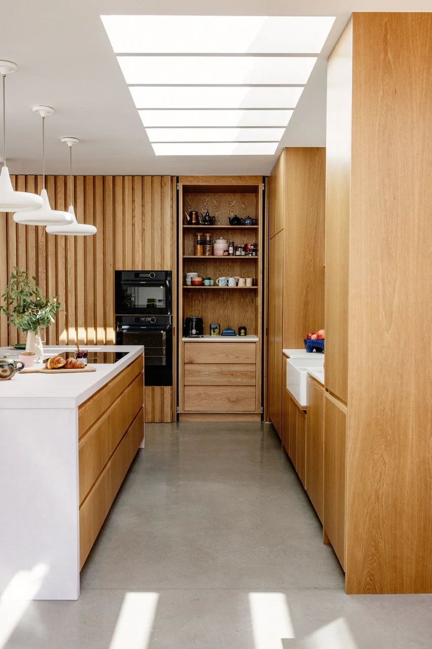 The style of the home’s exterior continues inside where exposed brickwork and polished concrete floors create a flow between outside and in. Solid oak panels line the walls of the passageway between the original house and the extension, enhancing the acoustics and adding a sense of intimacy.