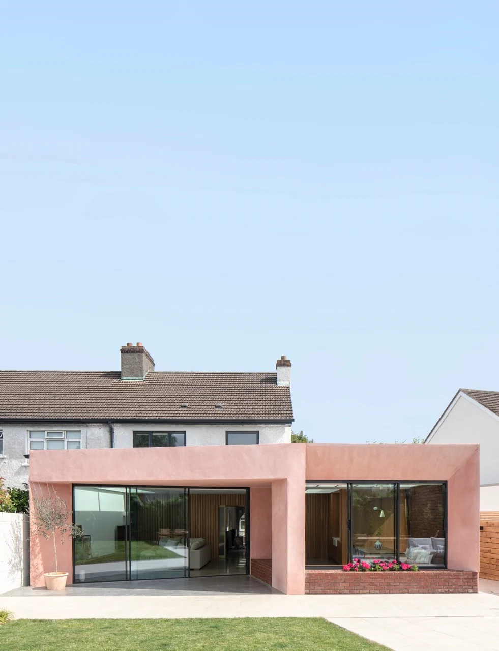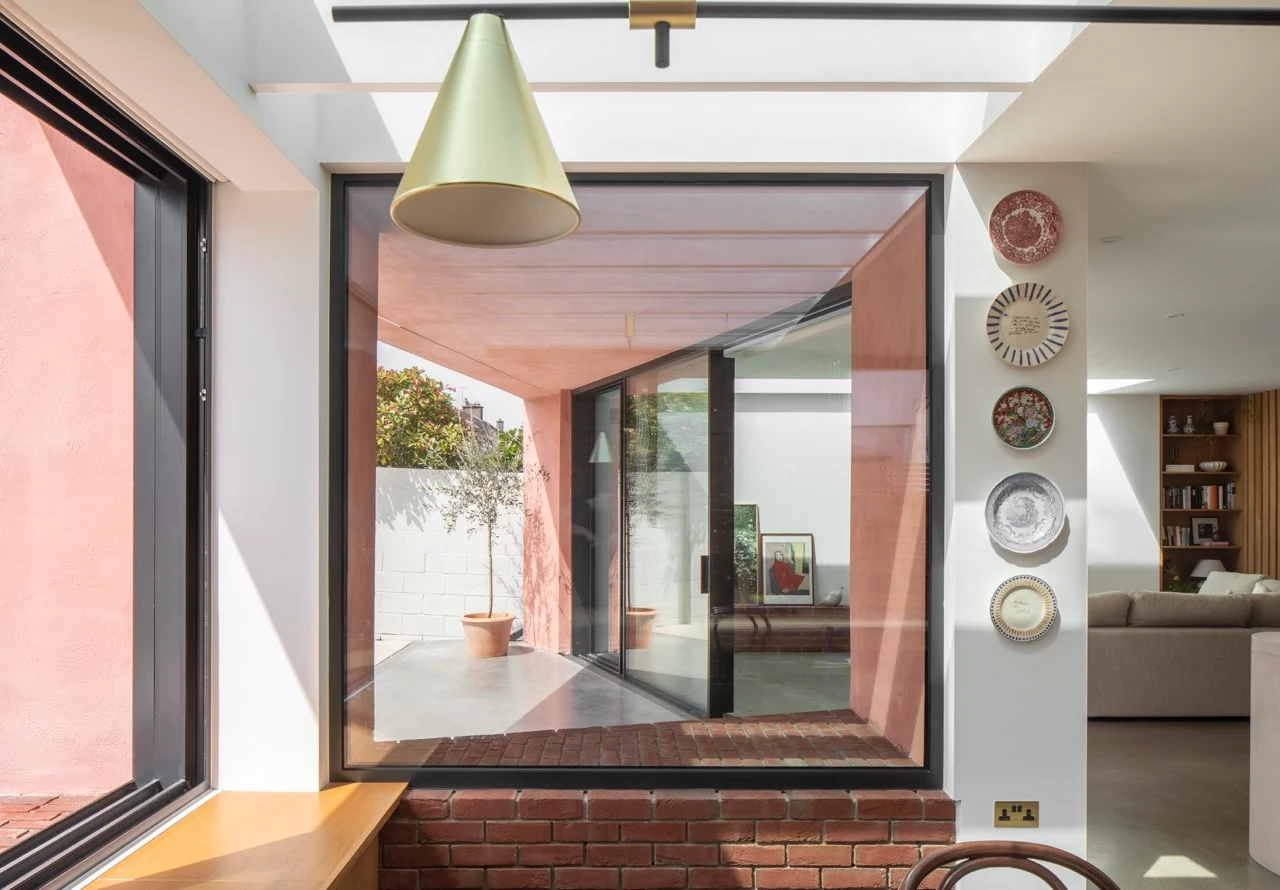 Along with the shower, the couple’s moodboard featured a photograph of a pink door which, unbeknownst to them, would influence the overall aesthetic of their home. “Courtney very much took the idea of the door and went a bit wild with it,” says Ciara, who was as excited as Richie when the architect suggested an external finish coloured with pink pigment.