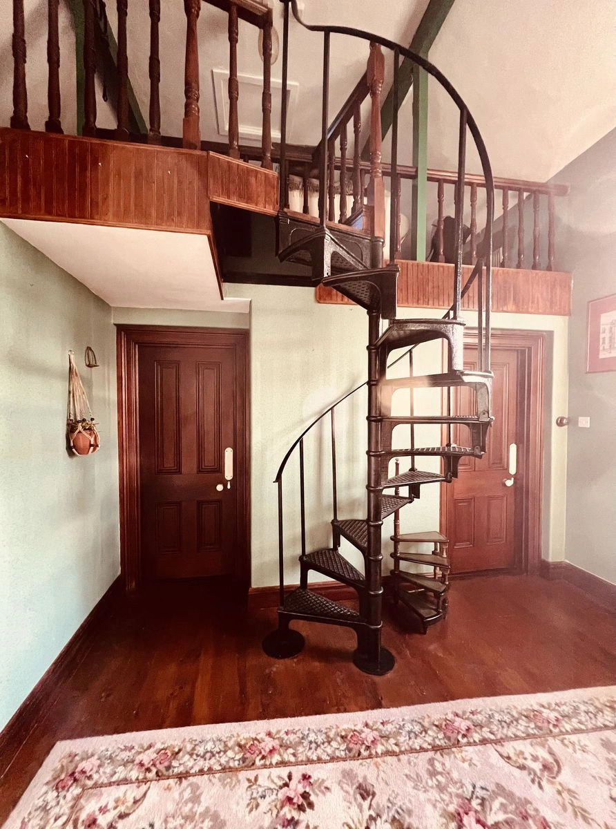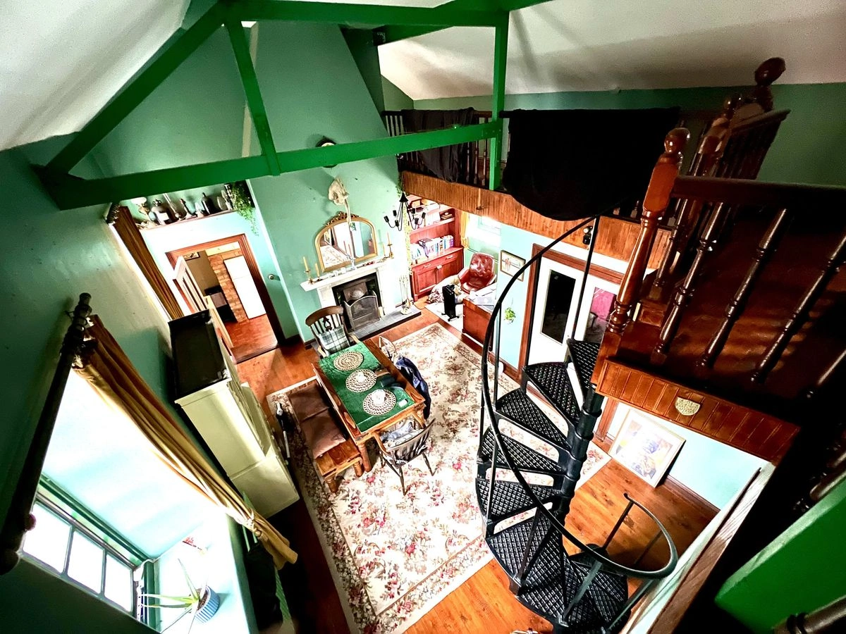 A spiral staircase connects the living/dining room with the upstairs mezzanine.