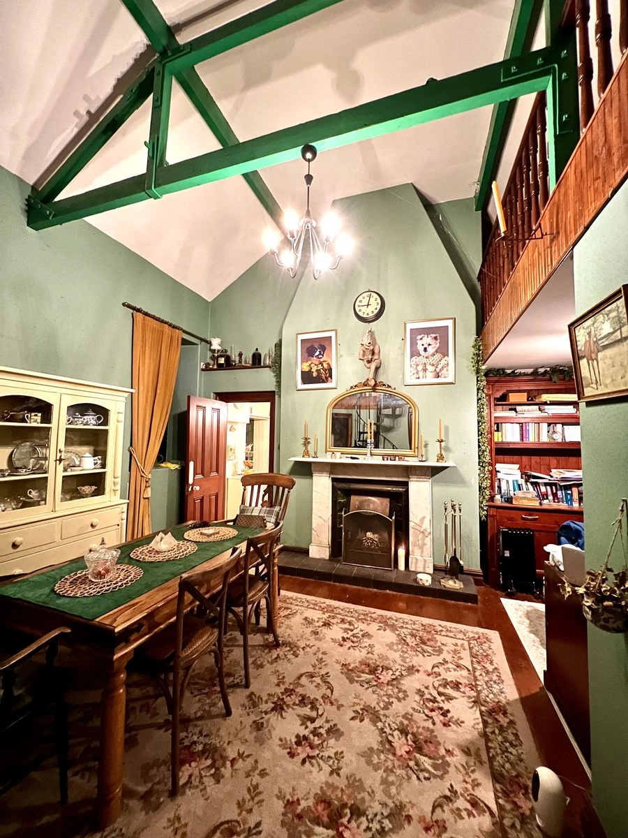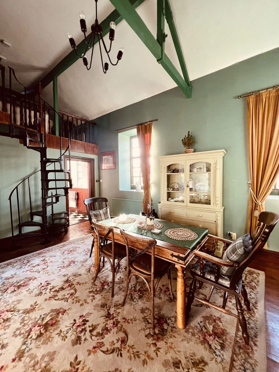 The property is approached via a short gravel drive – with ample parking space. A red front door opens onto a flagstone-floor hallway. Further inside is the open-plan dining/living room, with vaulted ceilings, solid wood flooring and a lovely antique fireplace.