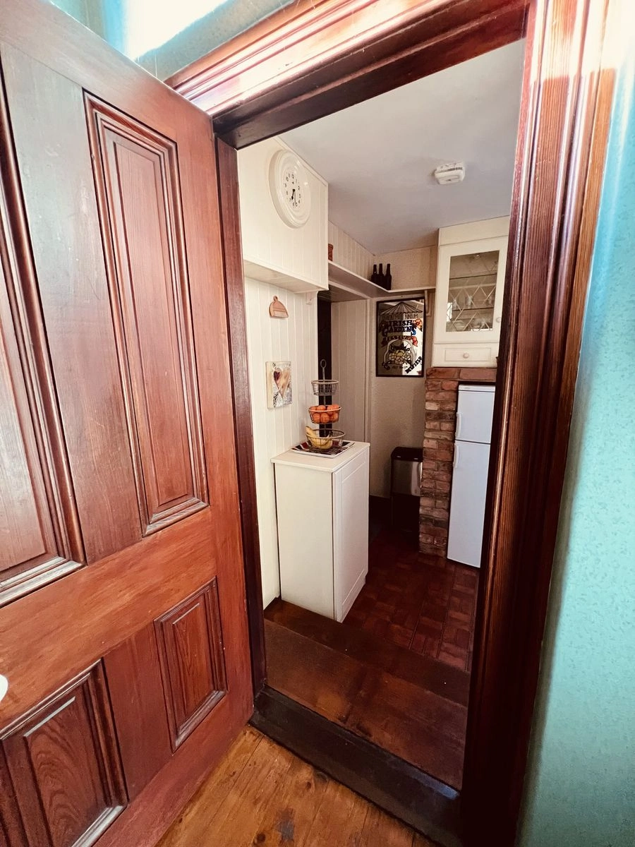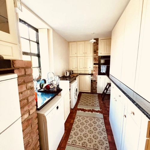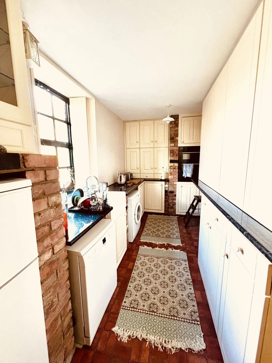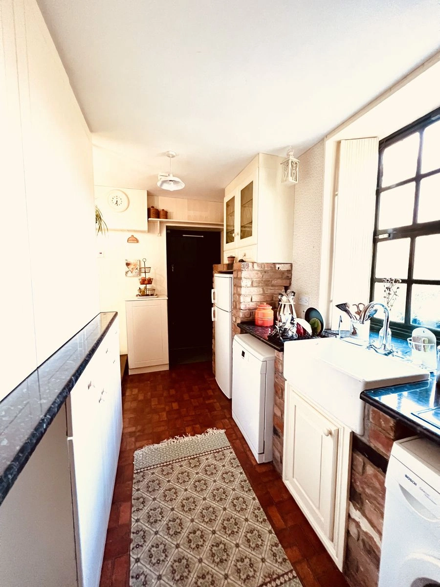 The kitchen, accessed via a connecting doorway, is narrow but conveniently laid out to make the most of the area. Cabinets line the walls at both high and low level, offering plenty of storage and counter space. Highlights include a Belfast sink, beautiful red brick accents and a large window which floods the space with natural light. Appliances range from a dishwasher, to a washing machine and fridge/freezer.