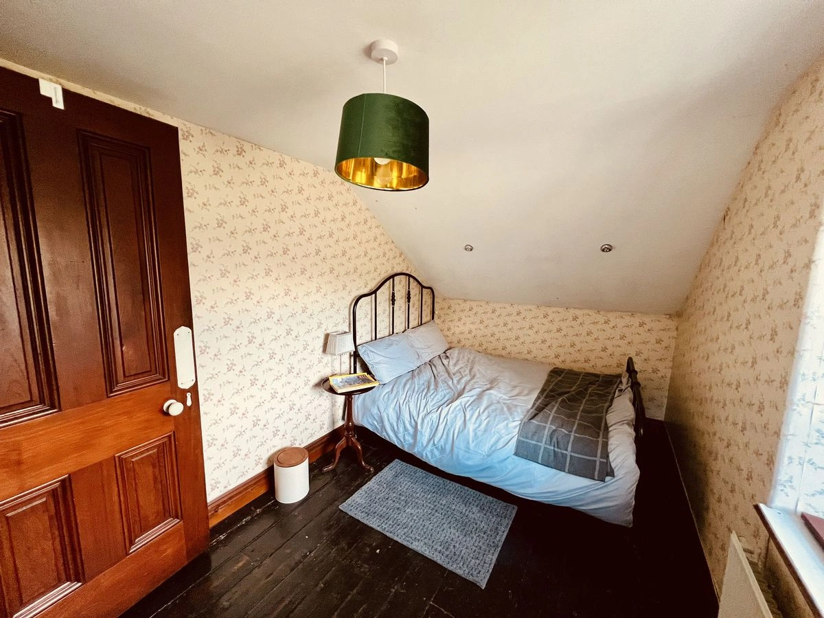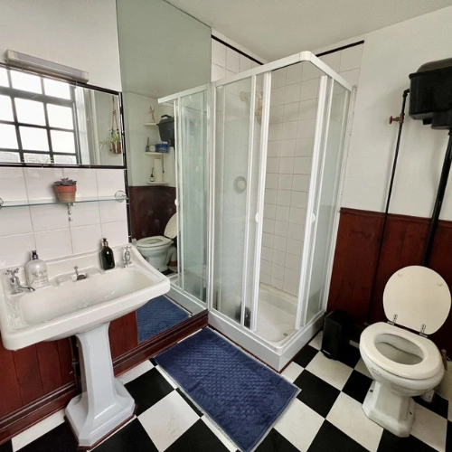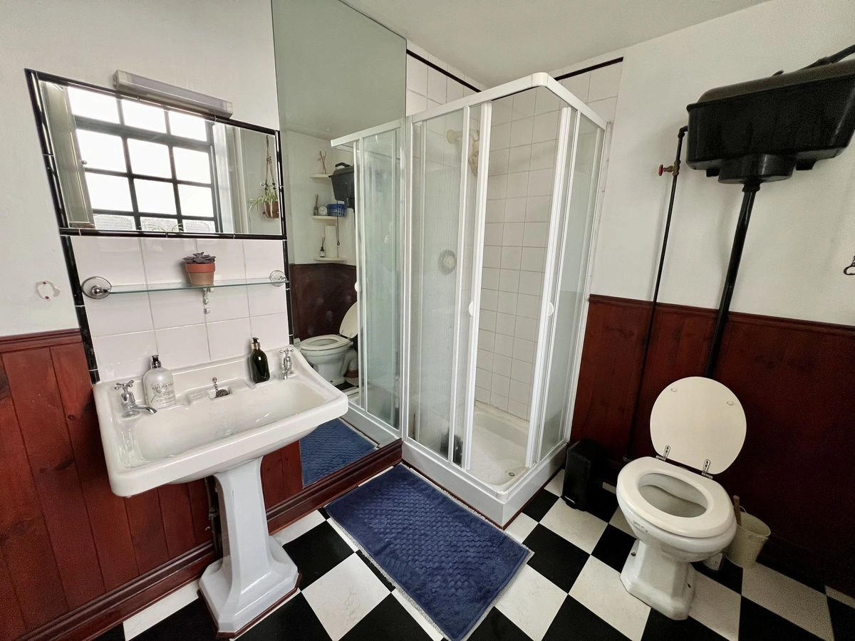 Solid wood flooring has been fitted in all three bedrooms – one of which is currently being used as a cosy sitting room – while the bathroom has black and white tiles, a shower, whb and antique wc.
