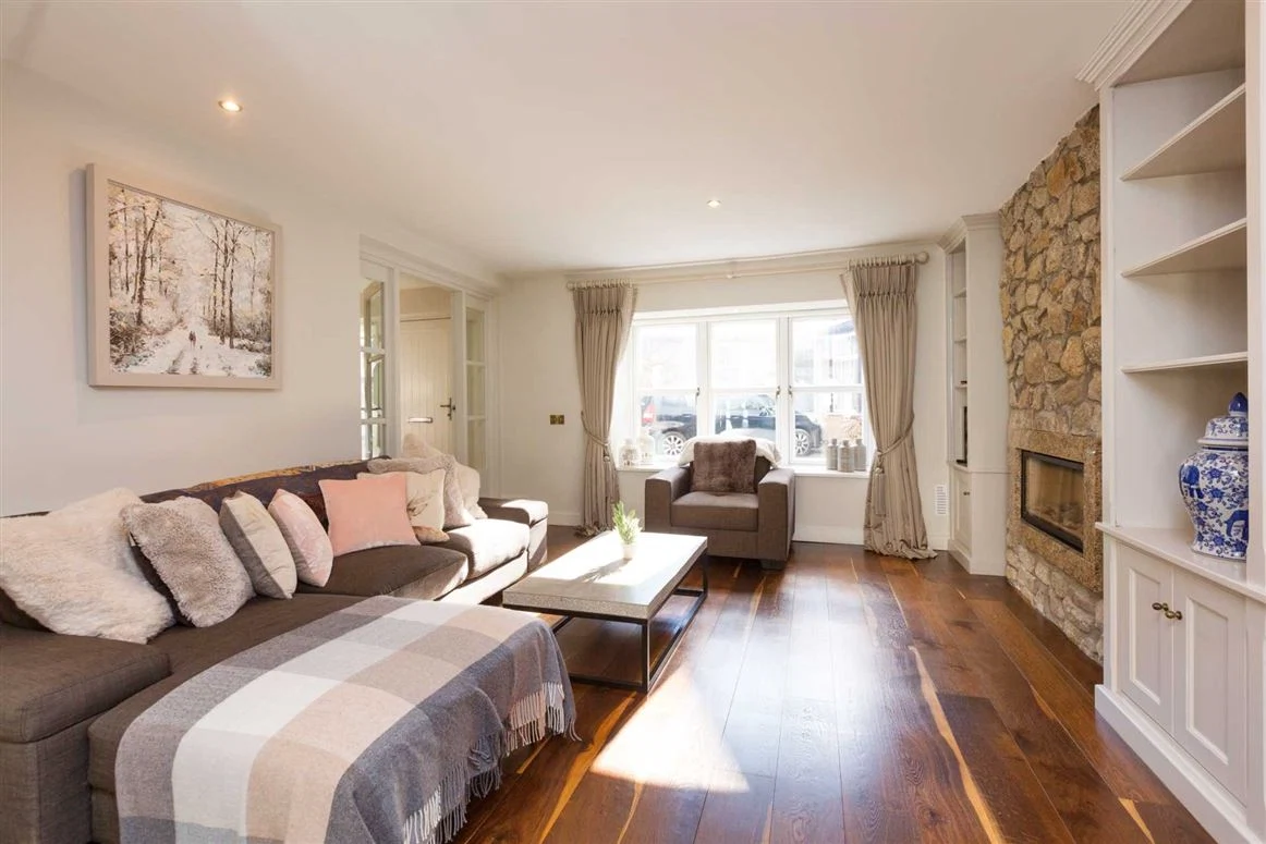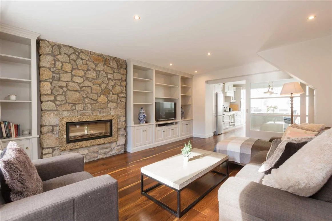 Glass French doors in the hallway lead into a very cosy living room. Here there are beautiful oak timber floors, which continue throughout the house, and a stone fireplace that mirrors the exterior with an inset gas fire. There are also built-in units in the alcoves on either side for storage and display.
