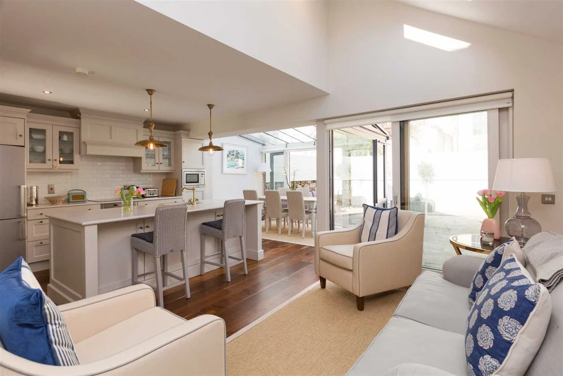 As you move through the house, it really opens out into the rear, where there’s a large, open-plan kitchen/living/diner, as well as a tidy guest WC. The seating area, lit with Velux windows in a vaulted ceiling that assures privacy, sits alongside the kitchen, making for a very social space.