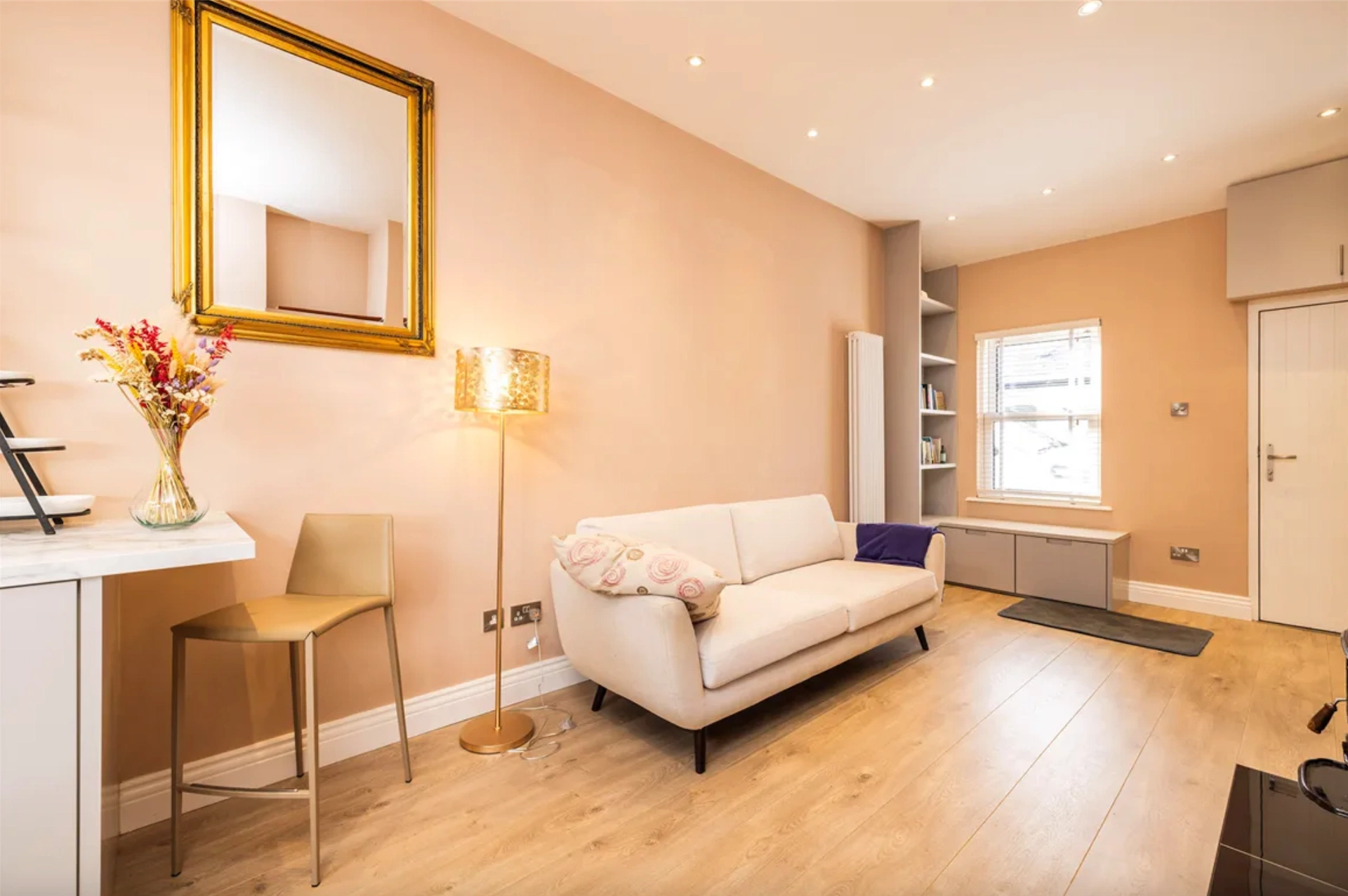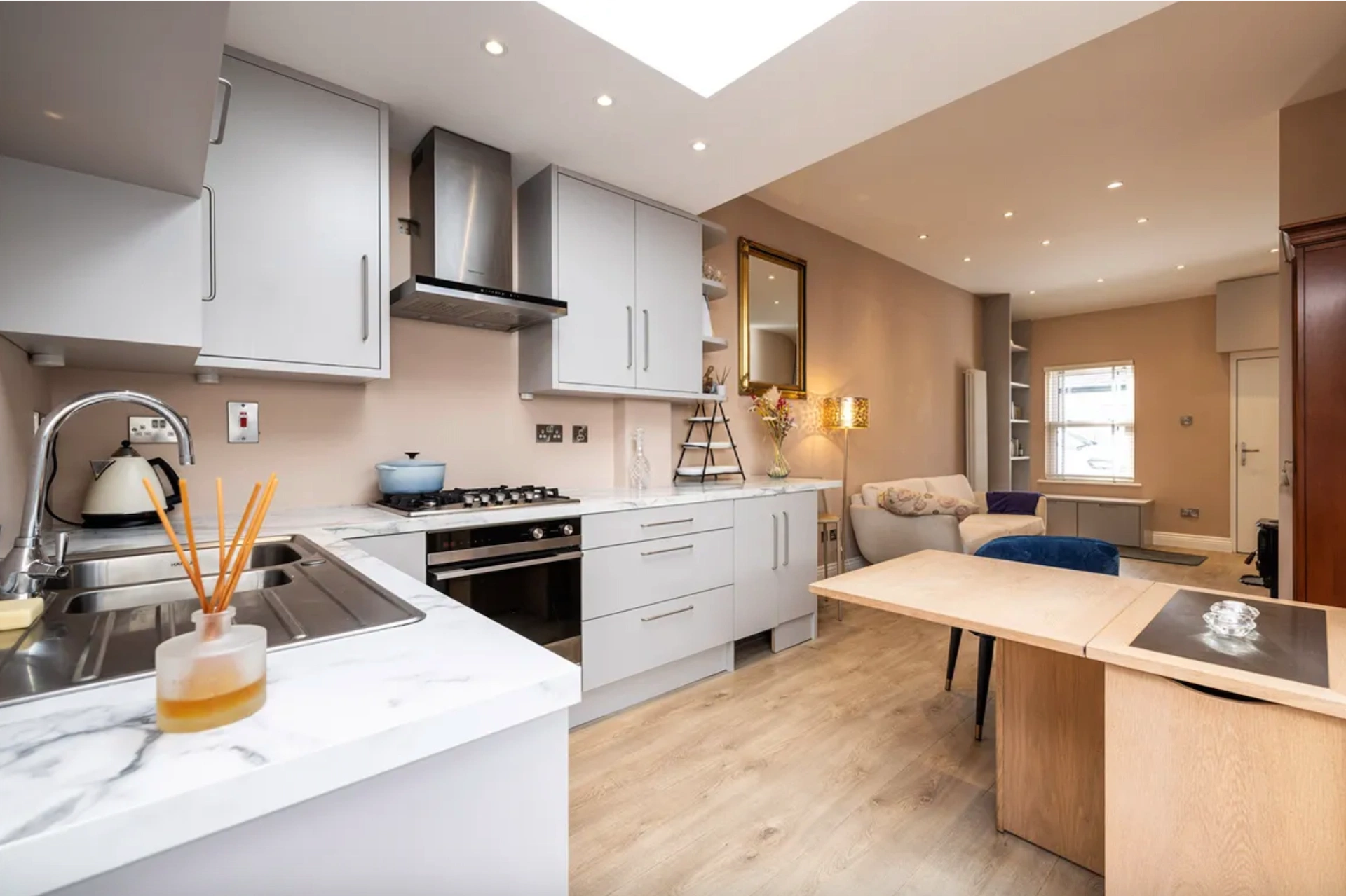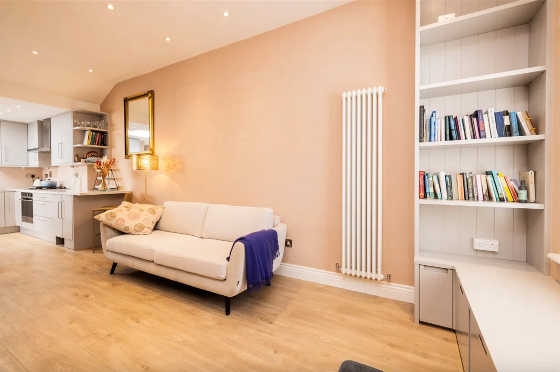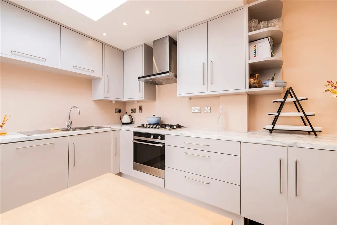 An end of terrace artisan cottage, this home has been recently refurbished, ensuring it feels bright and modern. You enter the home into the open plan living and kitchen space, which has been painted in a soft shade, given built-in storage to minimise clutter, and finished with a light timber floor to help maximise natural light. A stove provides a nice focal point to this space.