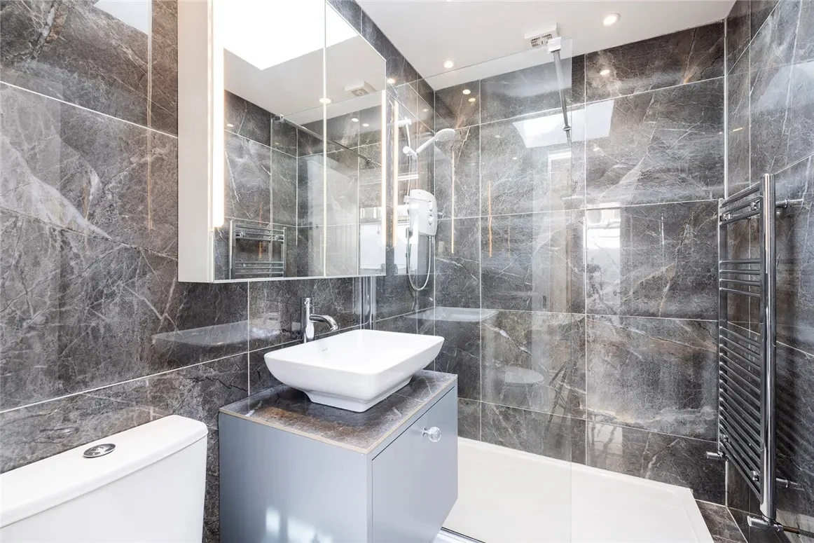 A bathroom sits behind the kitchen, which is tiled from floor to ceiling and has a walk-in shower and heated towel rail.