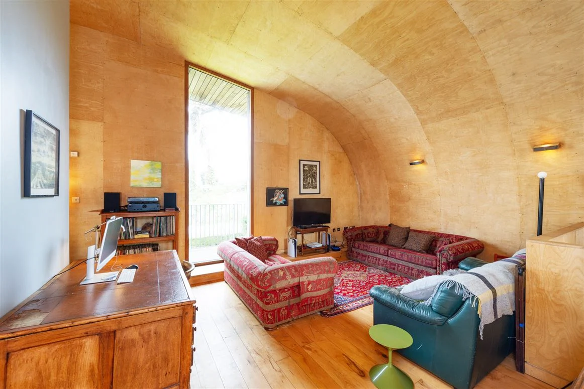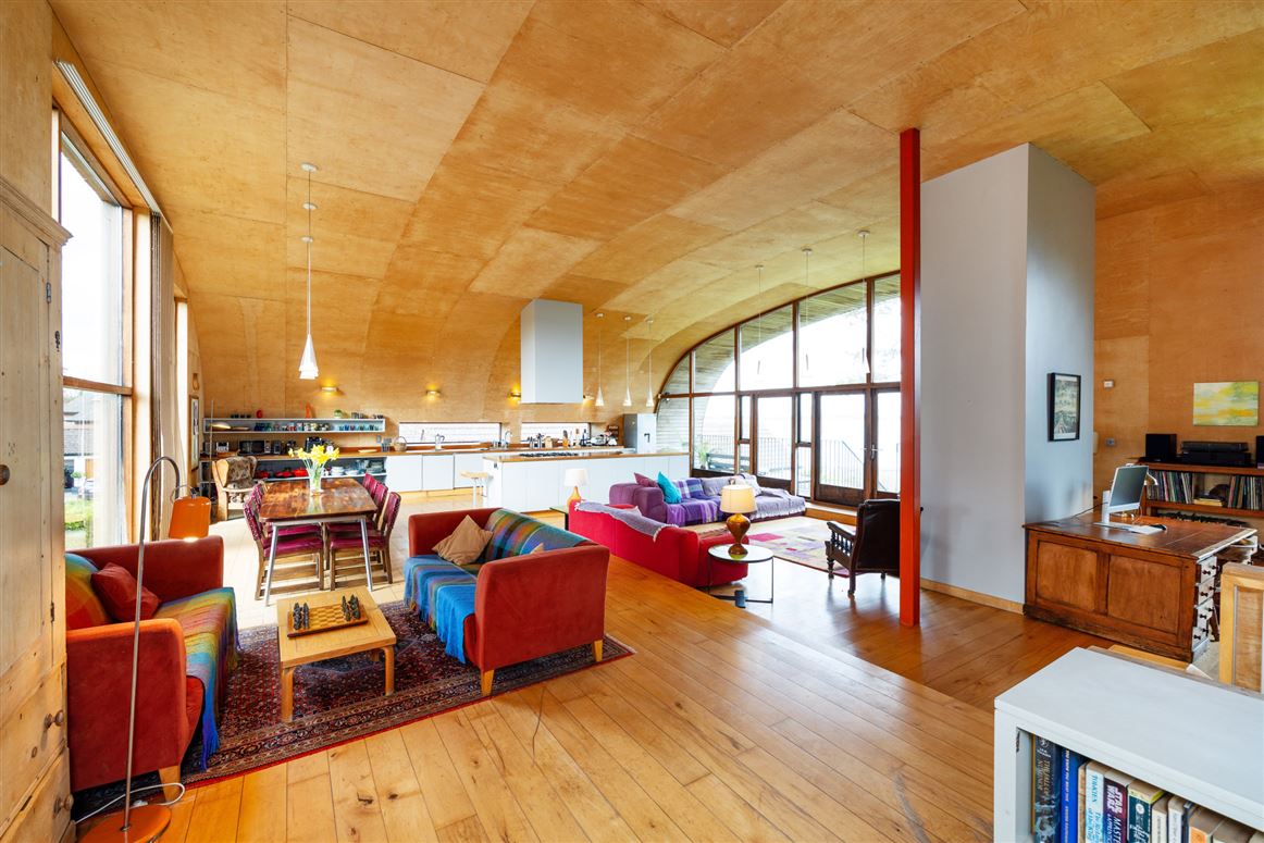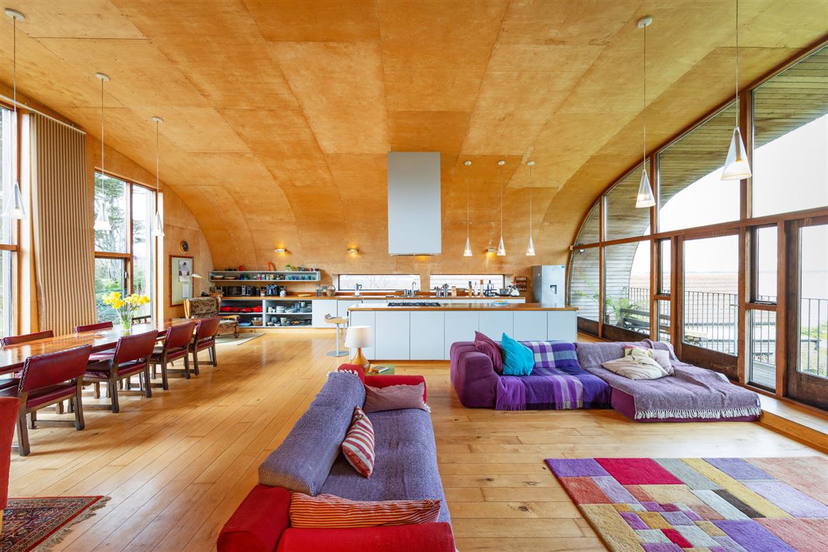 As you enter the home, a staircase leads you up to the first floor, where the living, kitchen and dining areas are. This generously sized space is accentuated by the gently curving ceiling, as well as large, dual aspect windows. The room has distinct zones, whilst feeling open and spacious, and glass doors lead to a long balcony with sea views. This space has a maple floor, underfloor heating, and a cast iron stove.