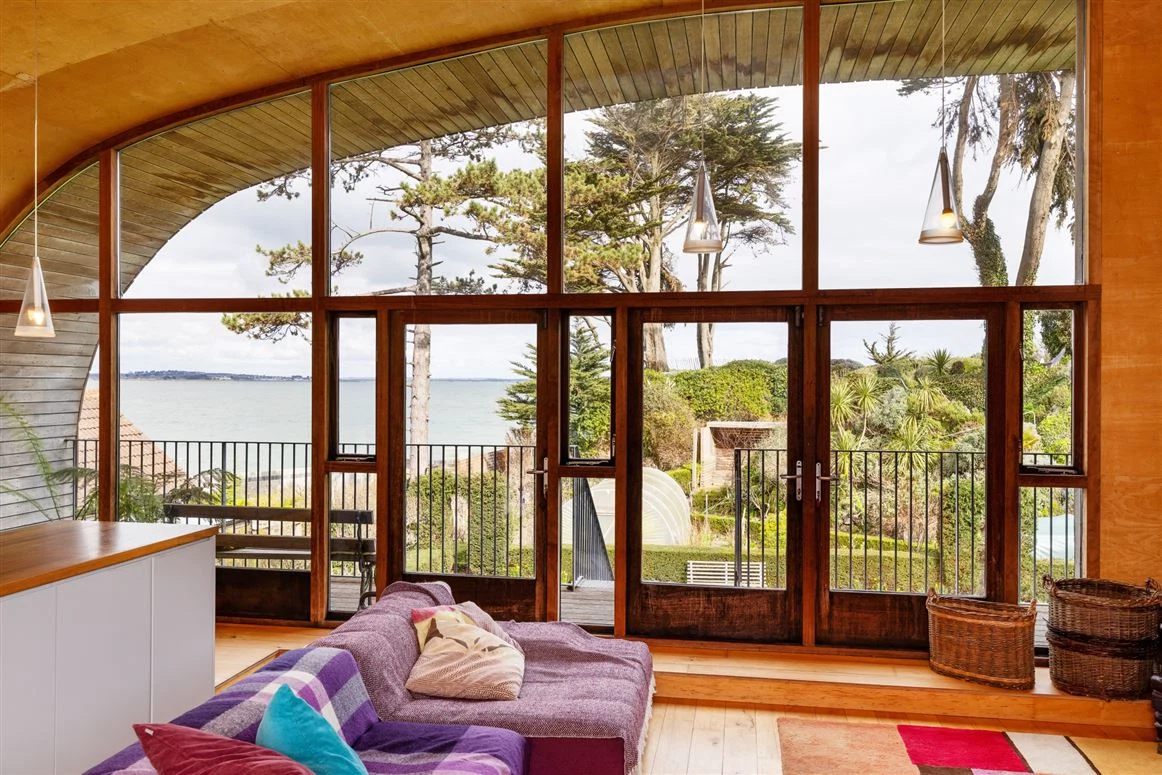 Once a detached bungalow, this incredible home was redesigned by McCullough Mulvin Architects. A singular arch curved metal frame was placed over the existing ground floor structure, creating a spectacular living space on the first floor, while its exterior is clad in cedar. This first floor makes the most of the home’s incredible views over North Burrow and Claremont beaches.
