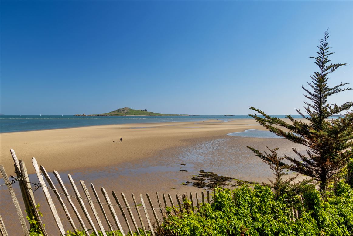 To the back there is a large lawn area, with a pebbled pathway leading to the beach, and there are also several seating areas and patios. There are also a number of sheds and polytunnels.