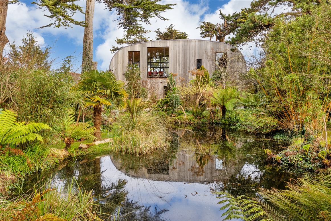 Outside, the 0.75 acres of garden are a real feature of this home. A man made pond sits to the front, surrounded by an array of plants including silver birch, tree ferns, palm trees, Japanese cherries and water lilies.