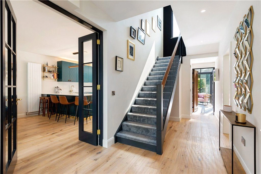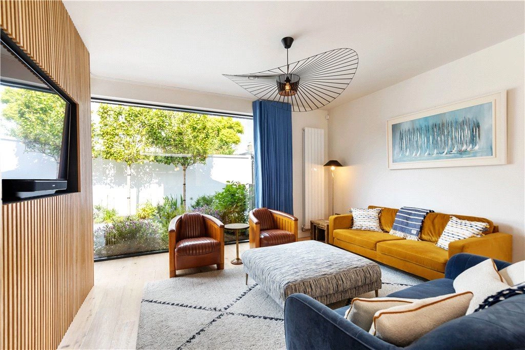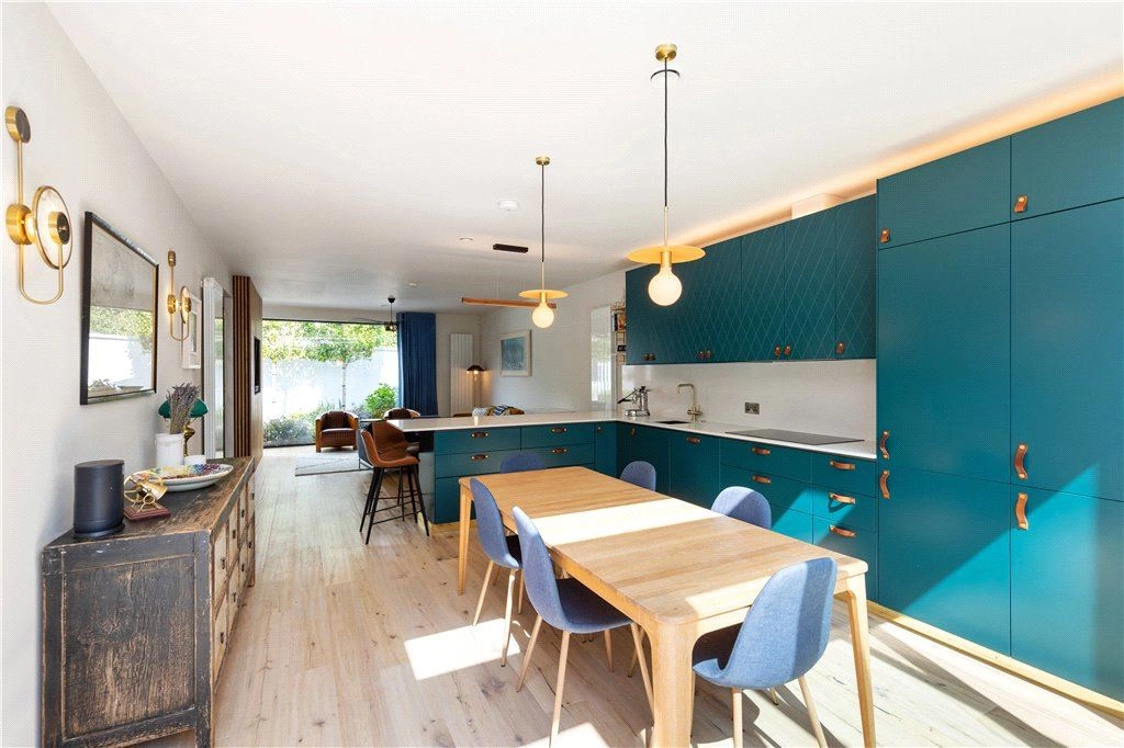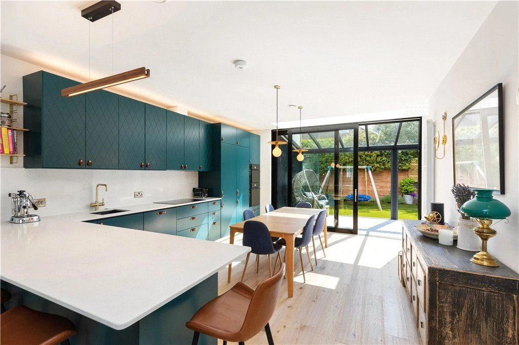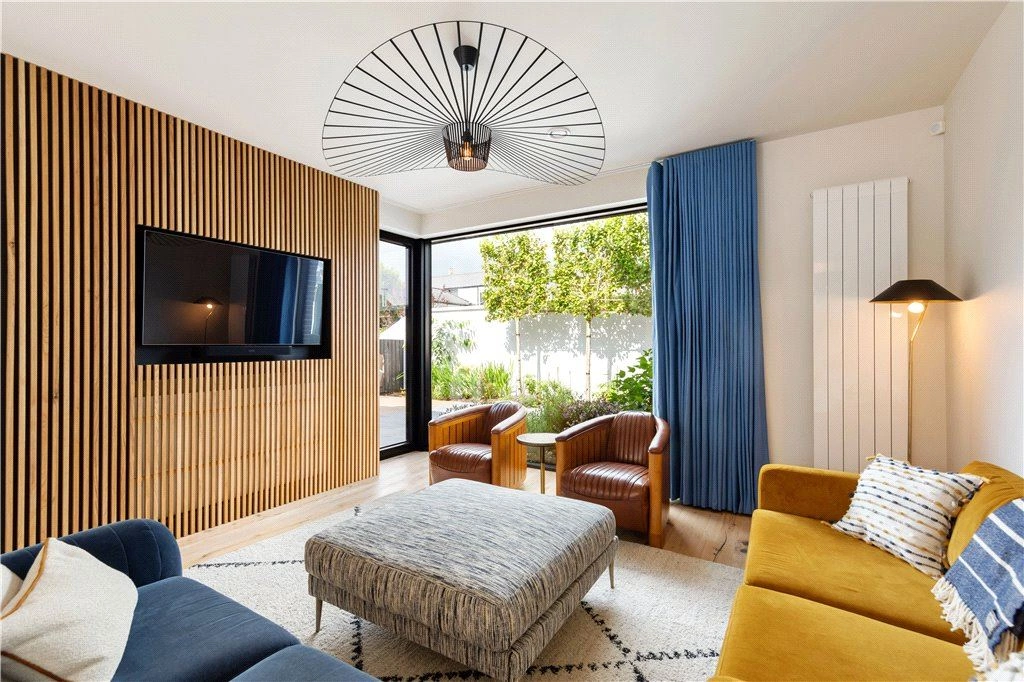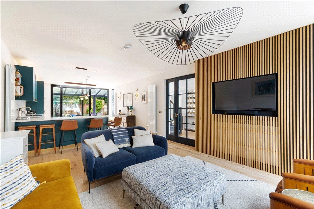 A tiled porch area with Crittall-style doors opens into the main entrance hall, off which you’ll find the heart of the home – an impressive open-plan living room/dining room/kitchen. Flooded with natural light, this dual-aspect space has a lovely flow throughout. In the living room, there is a large picture window overlooking the lush landscaped front garden while the kitchen features a breakfast bar and integrated appliances.