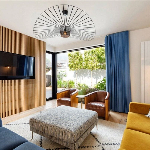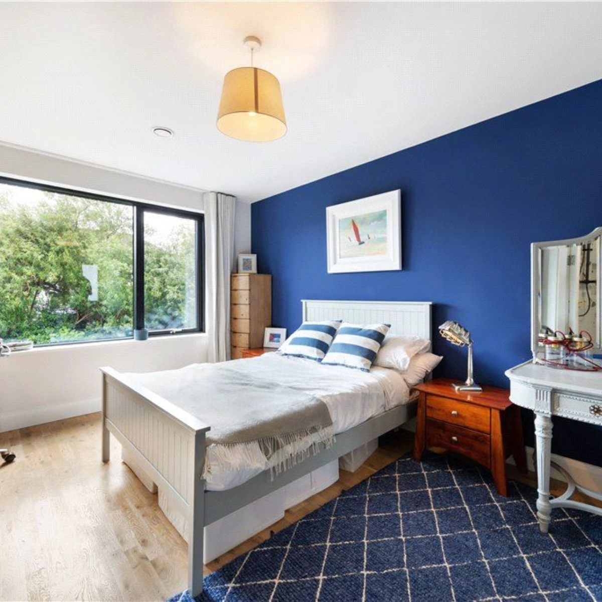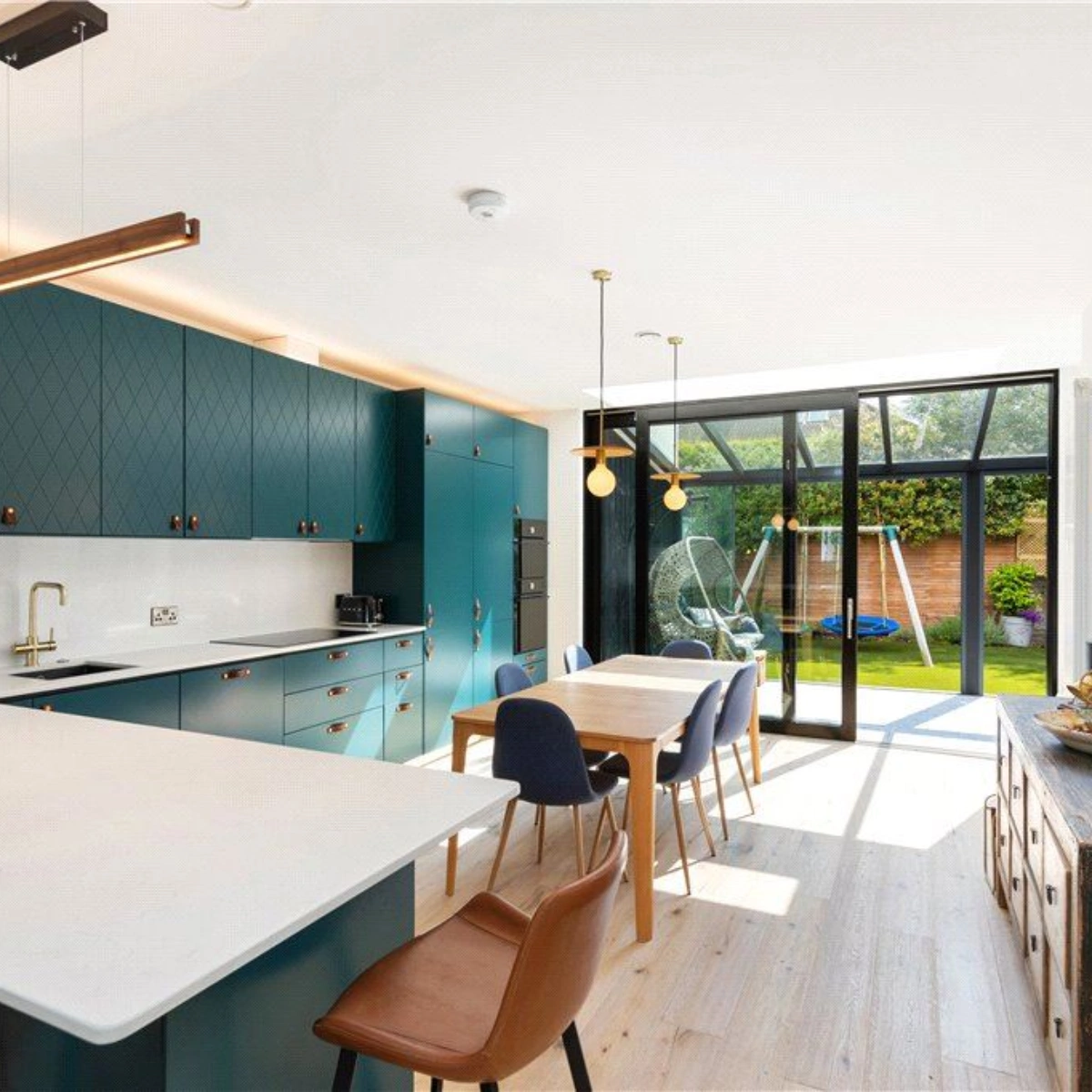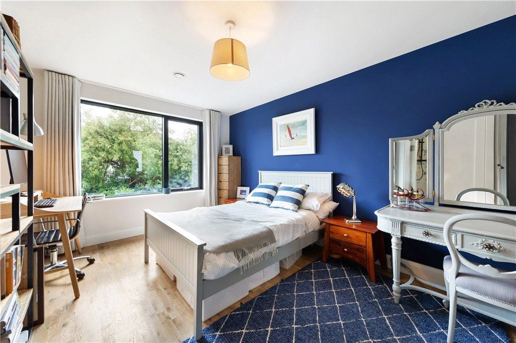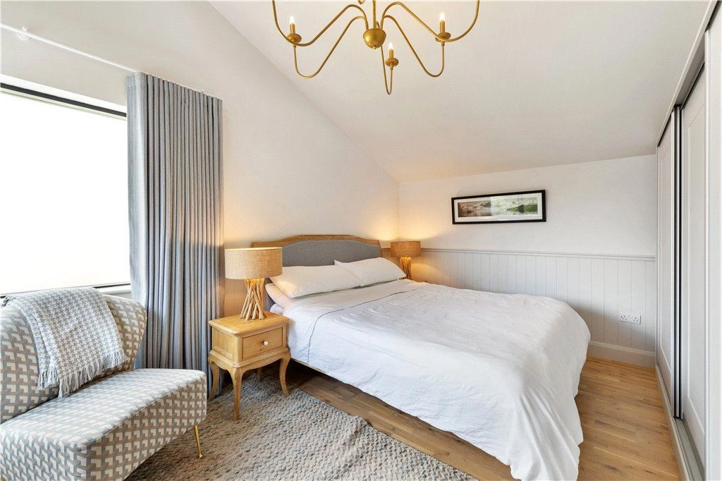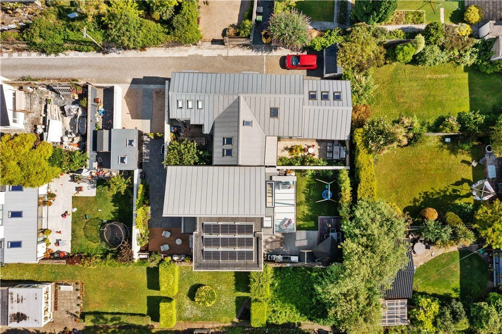 A tiled porch area with Crittall-style doors opens into the main entrance hall, off which you’ll find the heart of the home – an impressive open-plan living room/dining room/kitchen. Flooded with natural light, this dual-aspect space has a lovely flow throughout. In the living room, there is a large picture window overlooking the lush landscaped front garden while the kitchen features a breakfast bar and integrated appliances.