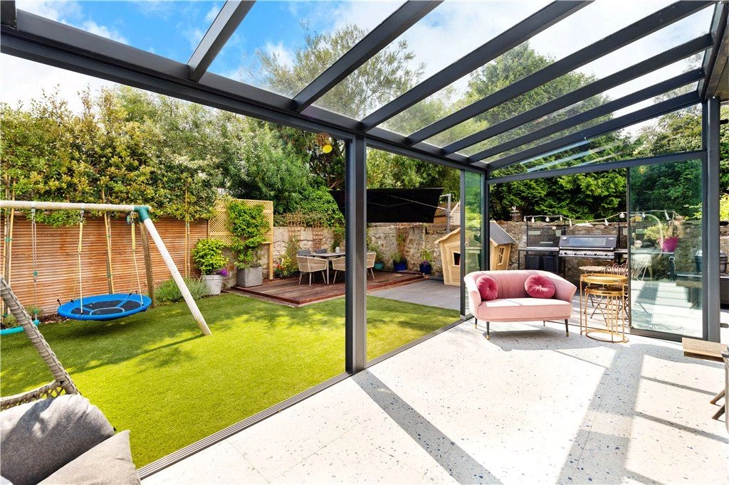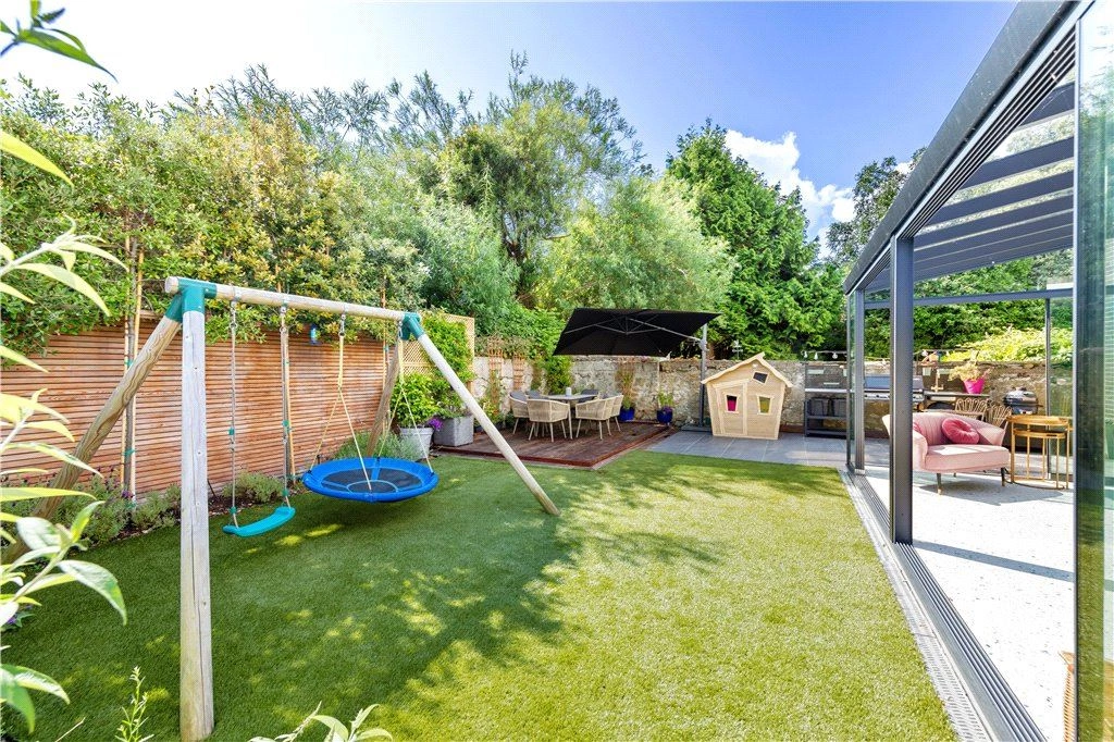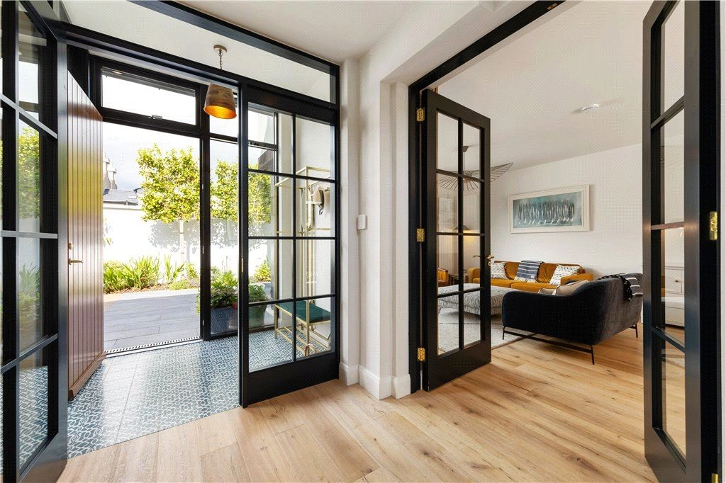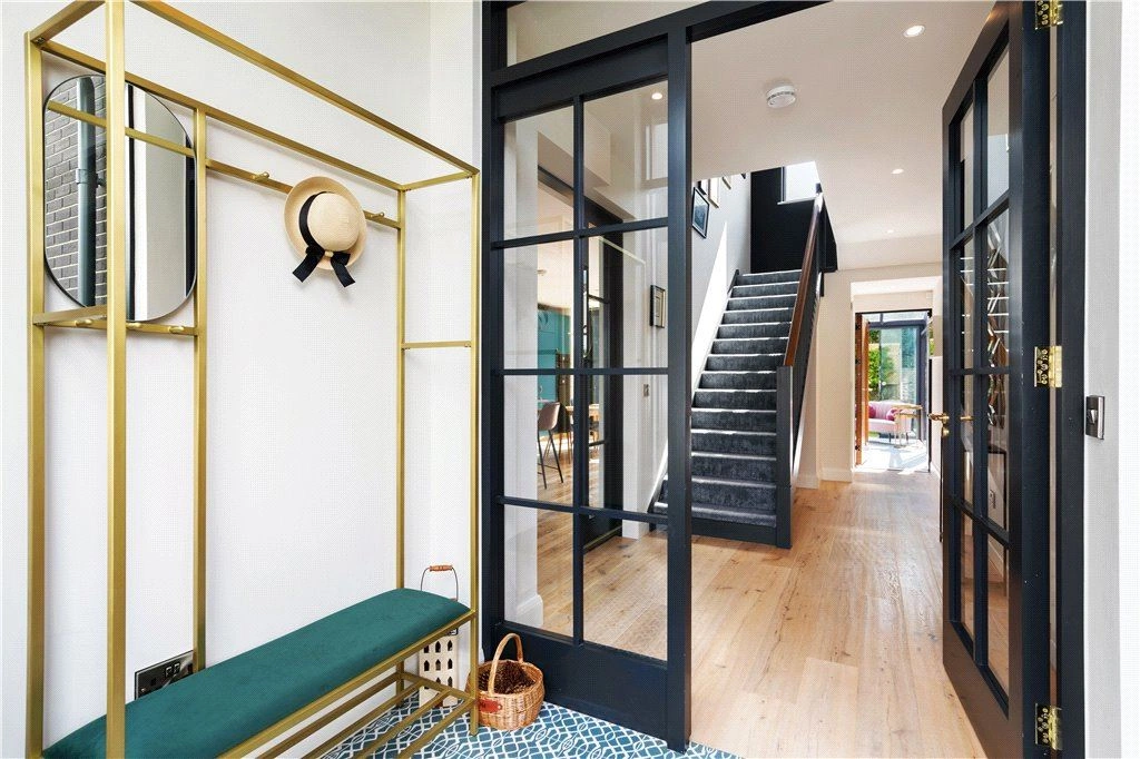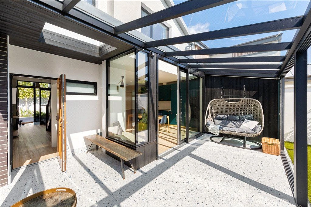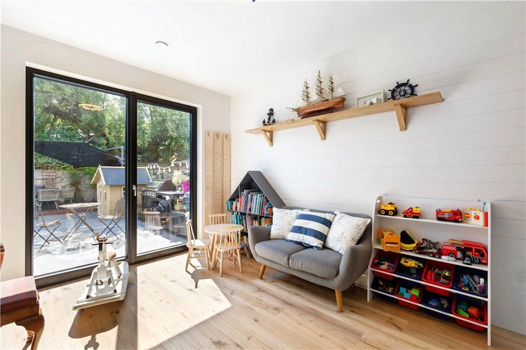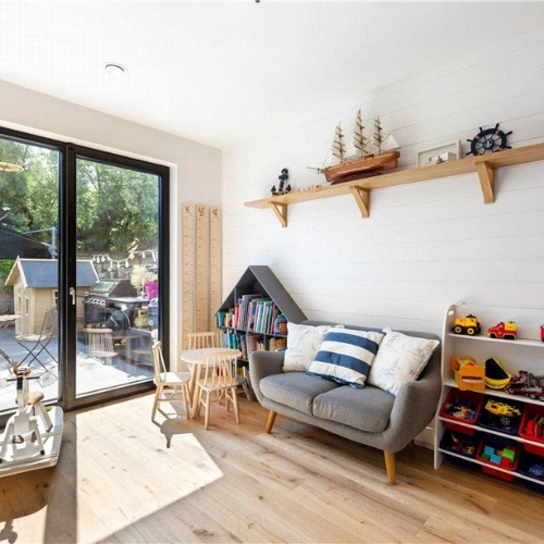 At the back of the house, a large L-shaped sunroom/entertaining space with a terrazzo effect tiled floor opens out to the rear garden via sliding doors. On the opposite side of the hall, there is a playroom/home office. A guest WC and laundry room complete the ground floor accommodation.