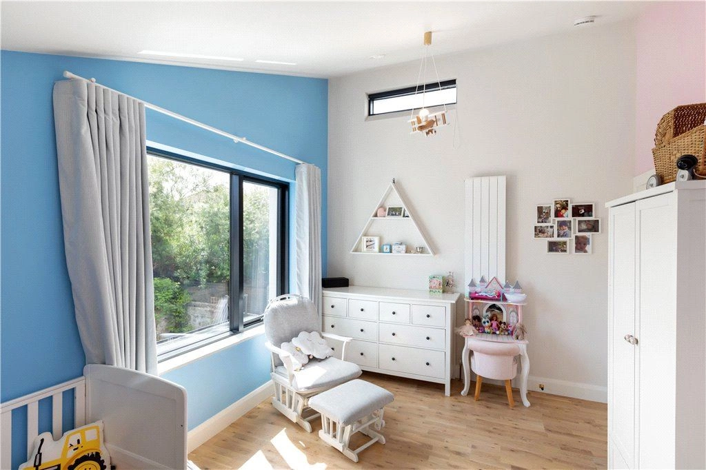 Extending to approximately 173 sqm, the accommodation spans two levels and comprises an entrance hall, utility room, kitchen/dining/living room, playroom/office, sunroom, three bedrooms and three bathrooms.