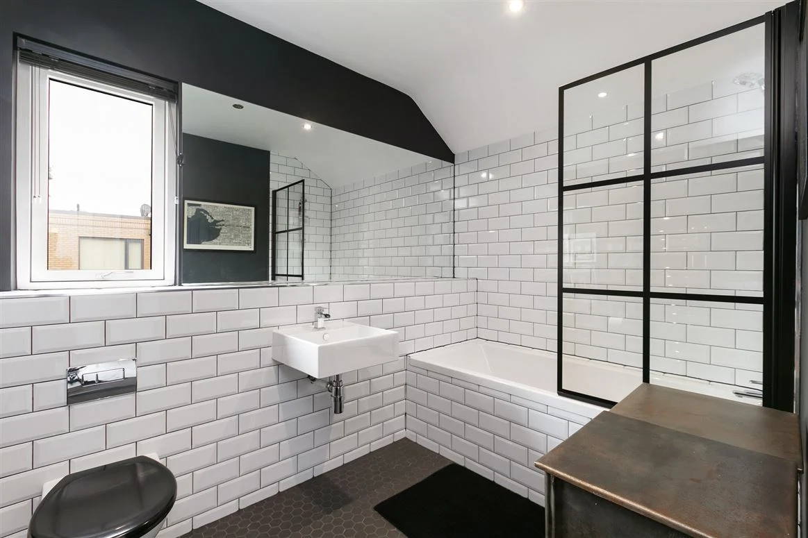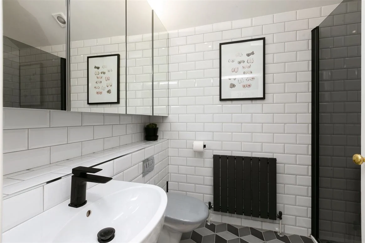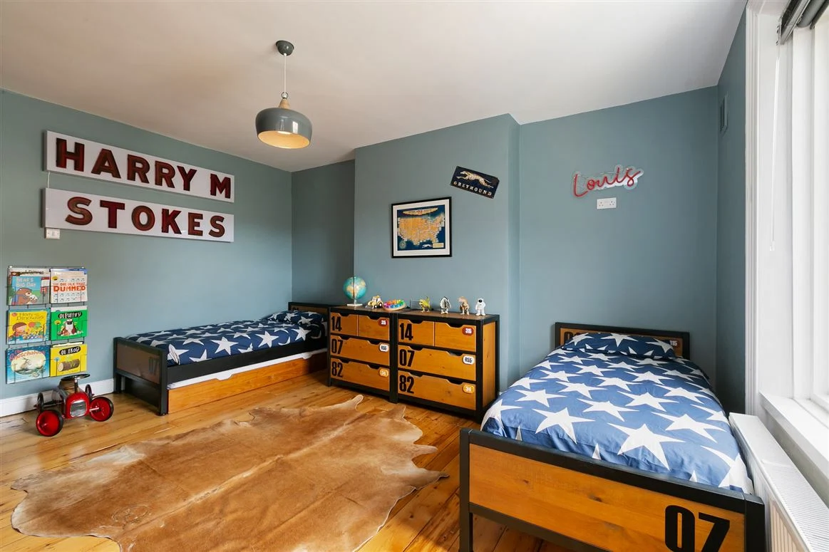 Upstairs, the main bedroom is the full width of the front of the house, with two large sash windows, a fireplace, and built-in shelving. There is a well-sized second bedroom on this level, as well as a shower room and family bathroom.