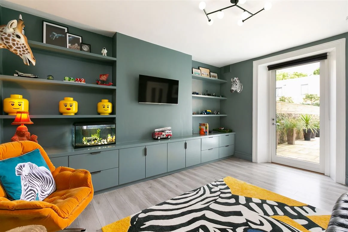 The second reception room has a glazed door to the back garden, as well as built-in shelving and cabinets.