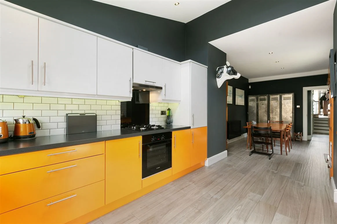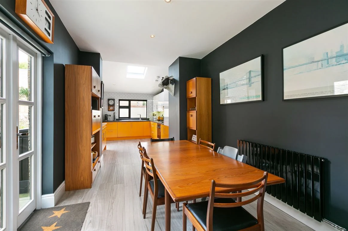 At the back of the house sits the kitchen and dining space. It is a long room with French doors to the back garden, a roof light in the kitchen space, and gloss units in contrasting white and orange.