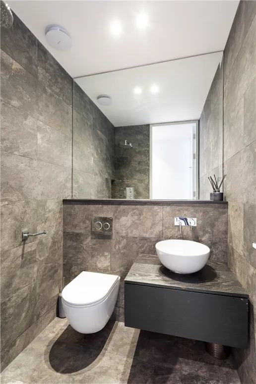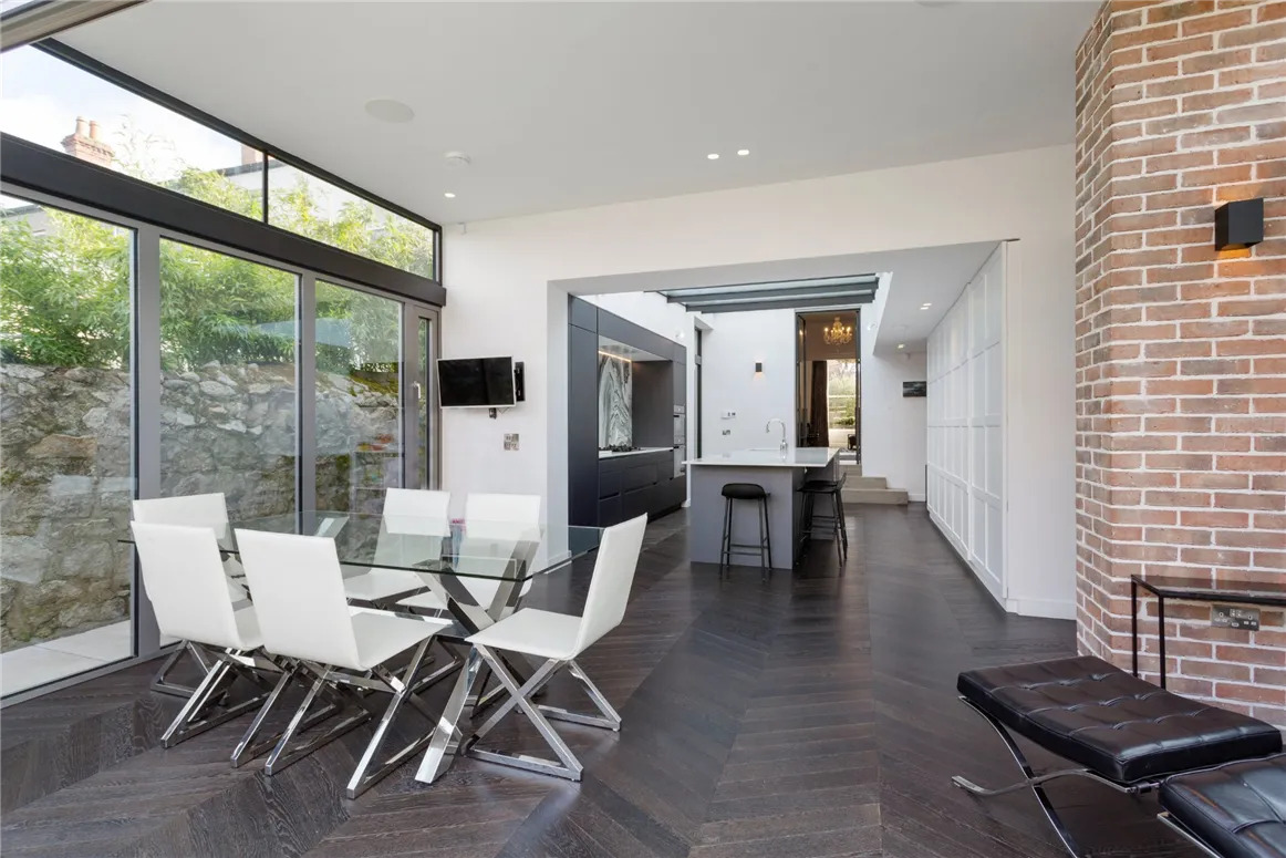 It’s a particularly impressive space, with a part-glazed roof, hardwood parquet floor with underfloor heating, and a panelled wall that conceals full height hidden kitchen units. An eye catching Nabucco marble splashback and 4 metre island together form the focal point of the space.