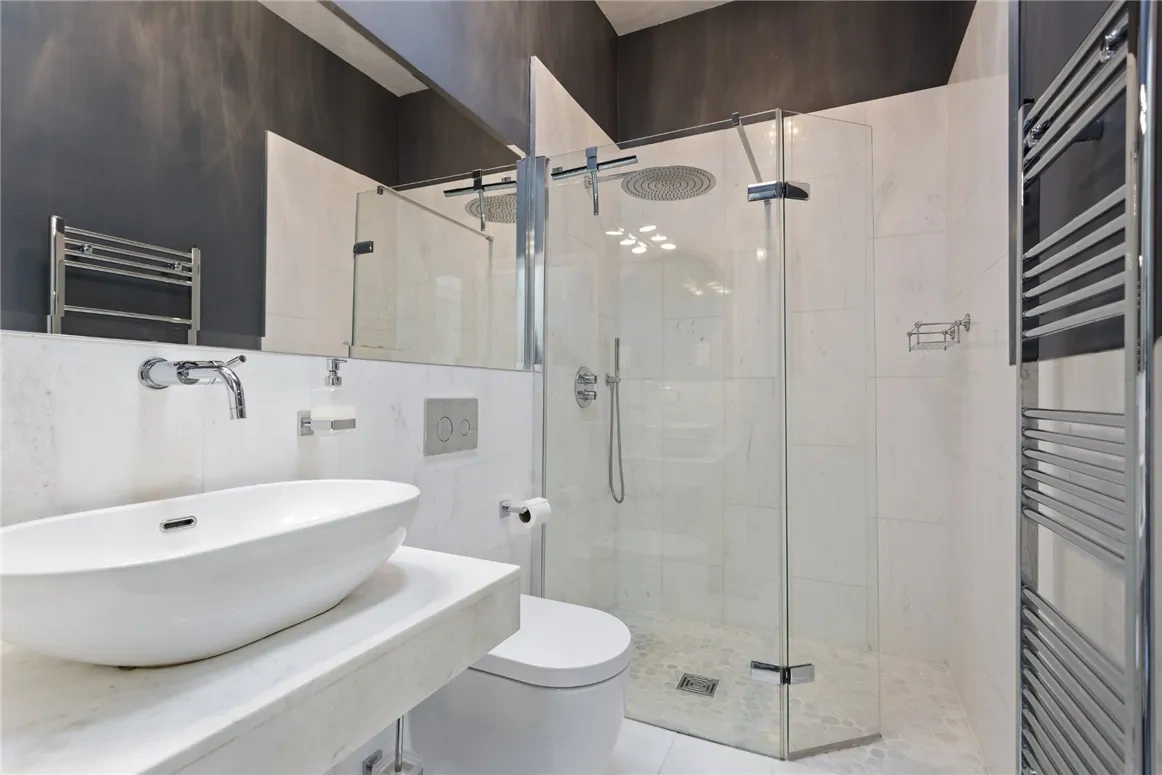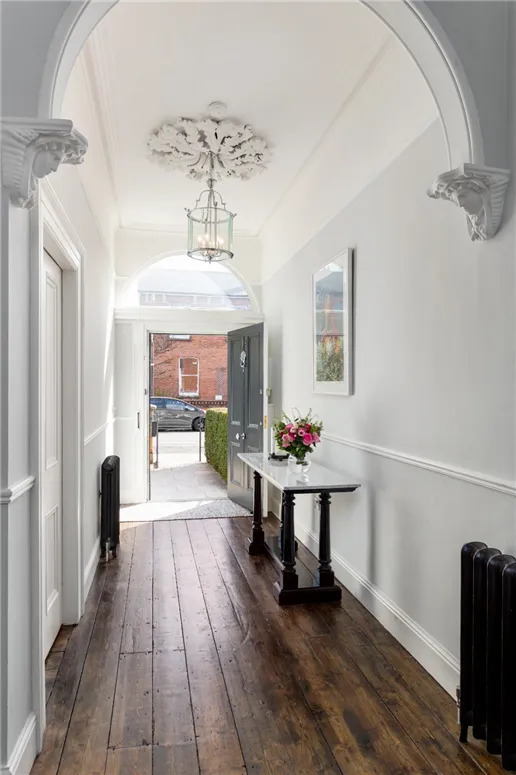 You enter the home into a hallway with a polished timber floor, elaborate ceiling centre rose and cornicing and cast iron radiators. The palette of cool neutrals continues in the two interconnected reception rooms to the right of this space.