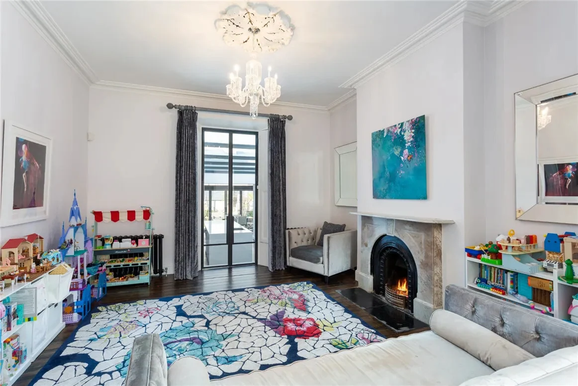 The drawing room, which sits to the front of the house, has a large sash window, while both spaces have matching marble fireplaces and high ceilings, adding to the sense of space. At the back of the living room there are Crittall-style steel doors that open up to the extension, which houses the kitchen and dining room.