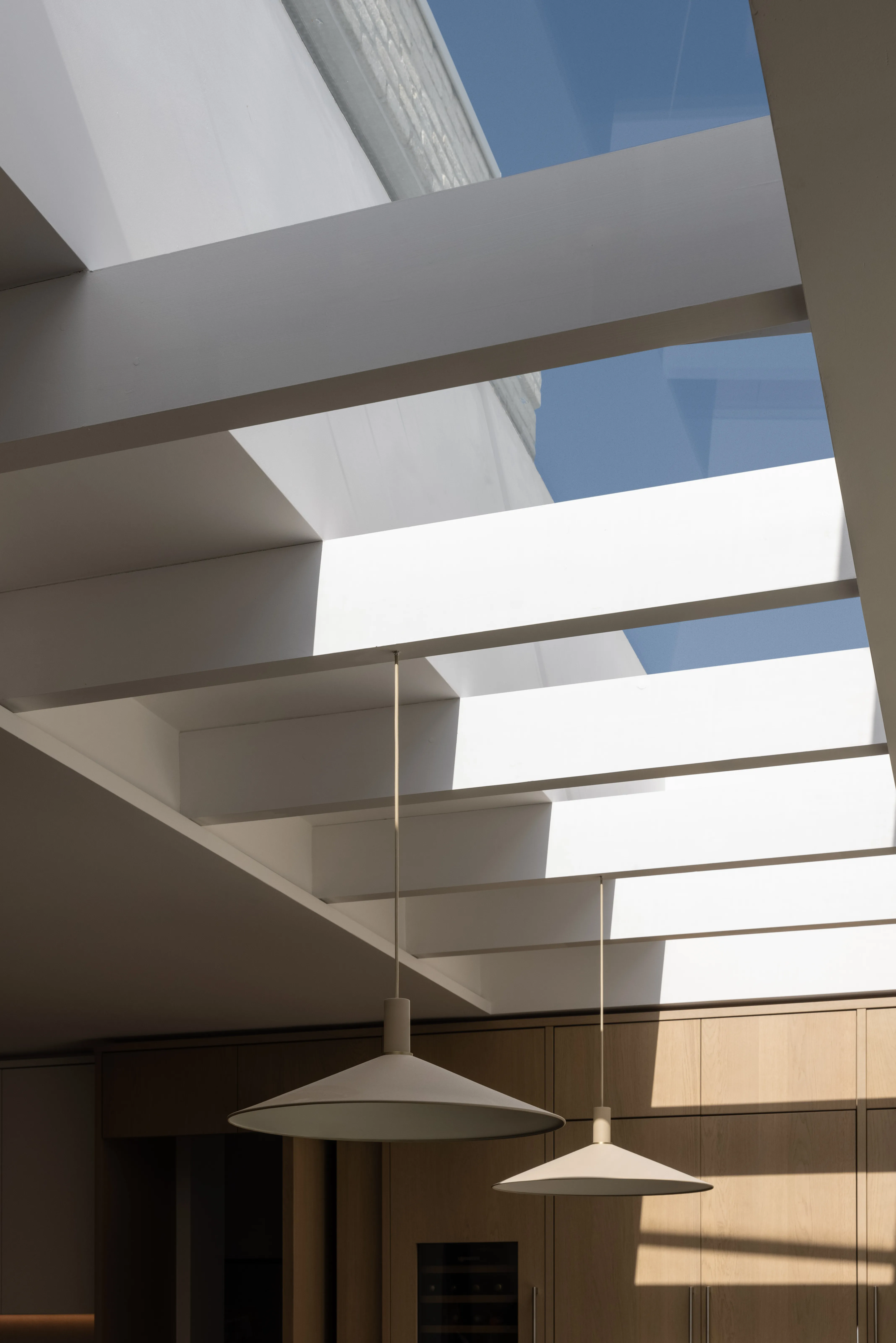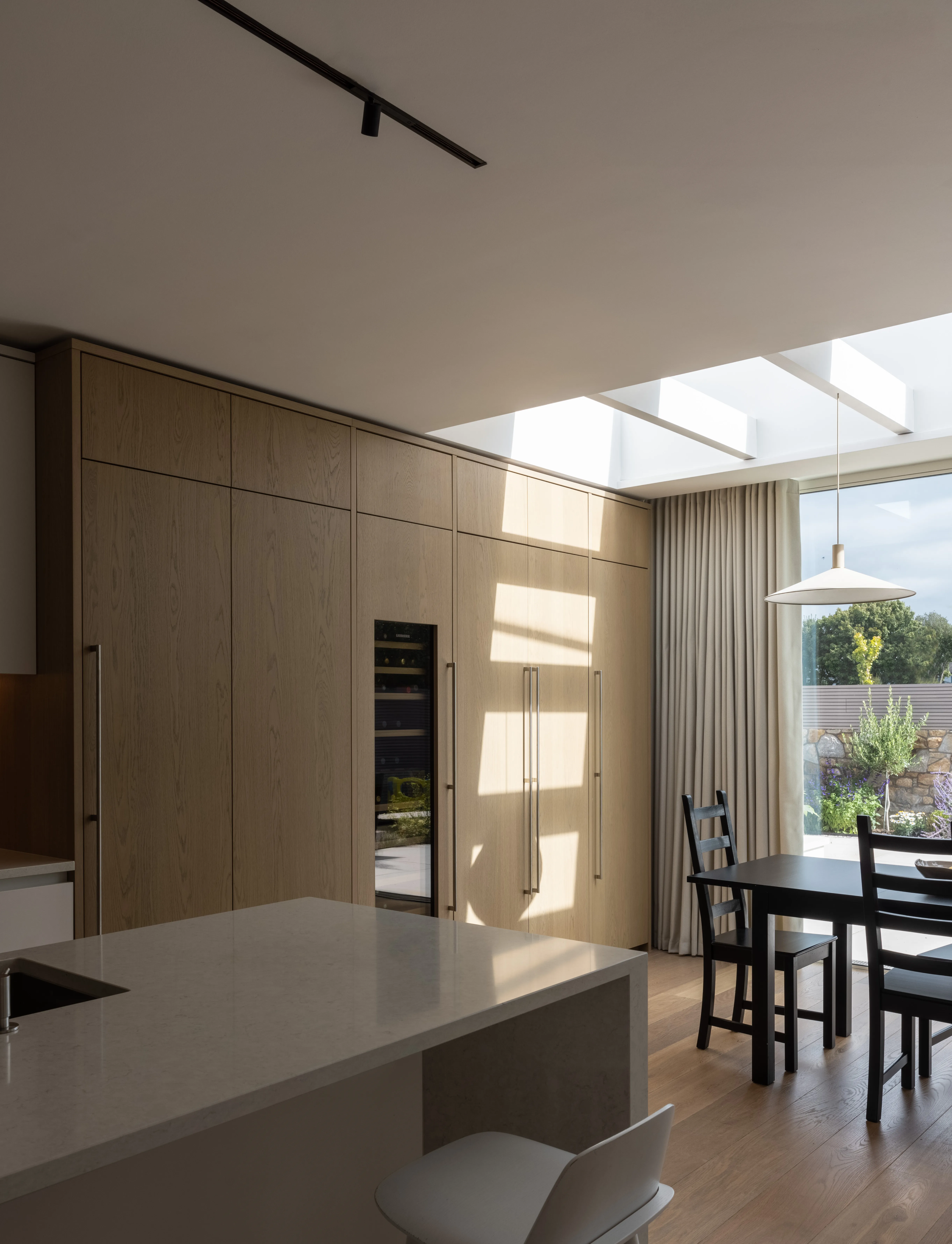 Adding light wherever possible was also essential to this design. “Light is the defining quality of this project,” Róisín says, “which was maximised through the use of rooflights in key locations. A large linear skylight over the dining table features a rhythmic grid of timber beams creating a constantly shifting play of shadow and light as the sun tracks overhead. A new rooflight over the staircase makes the journey between floors an unexpectedly calm and considered experience.”
