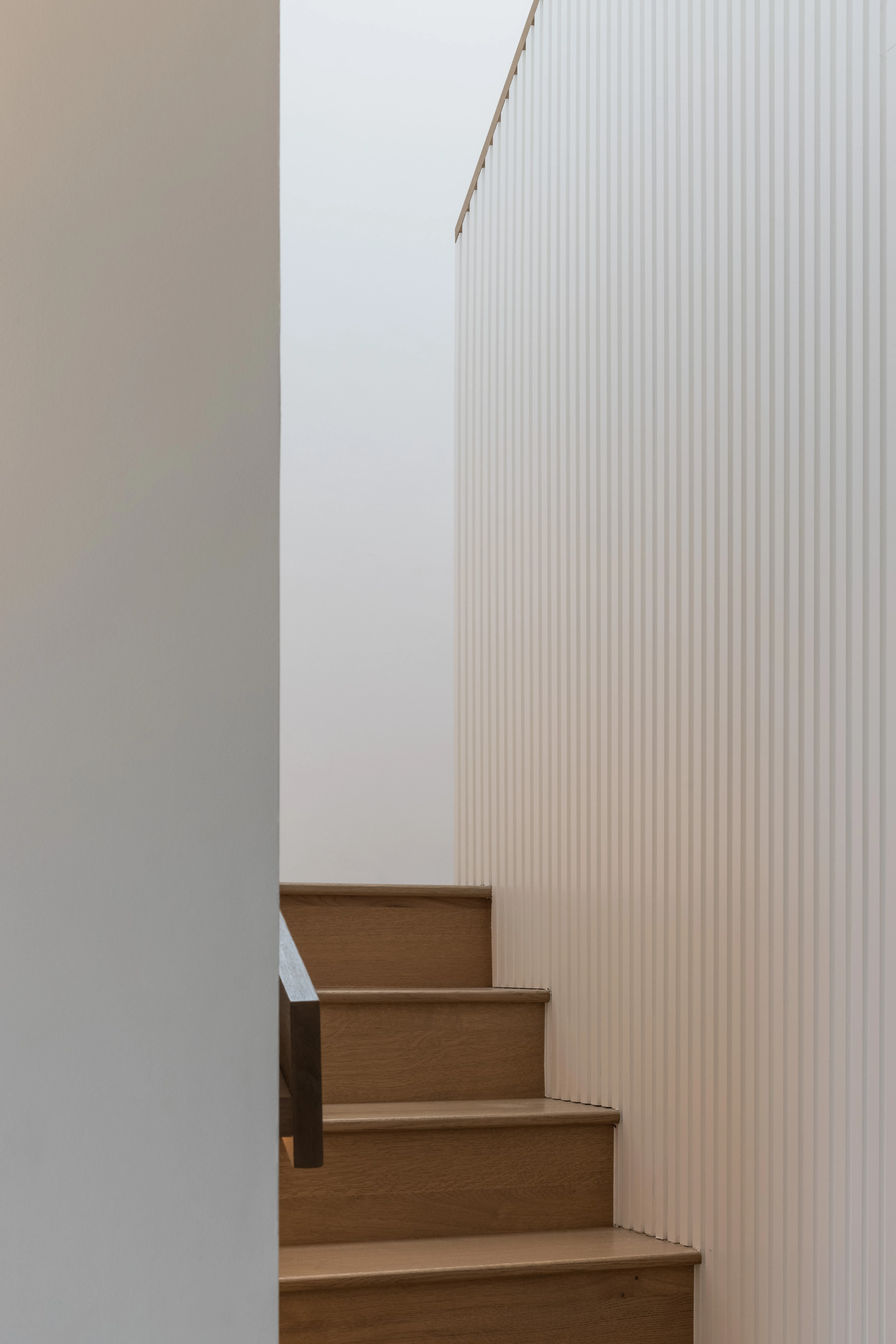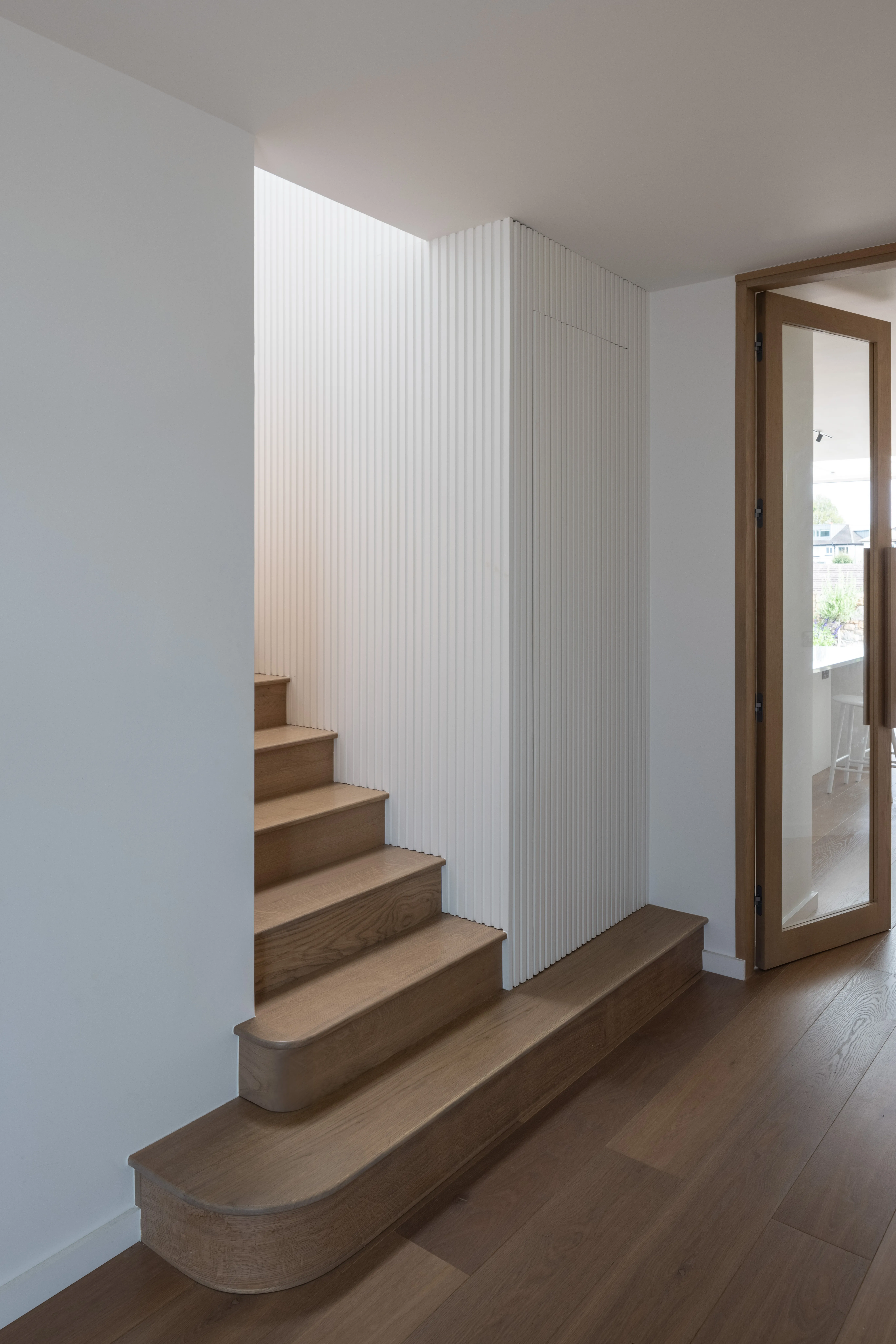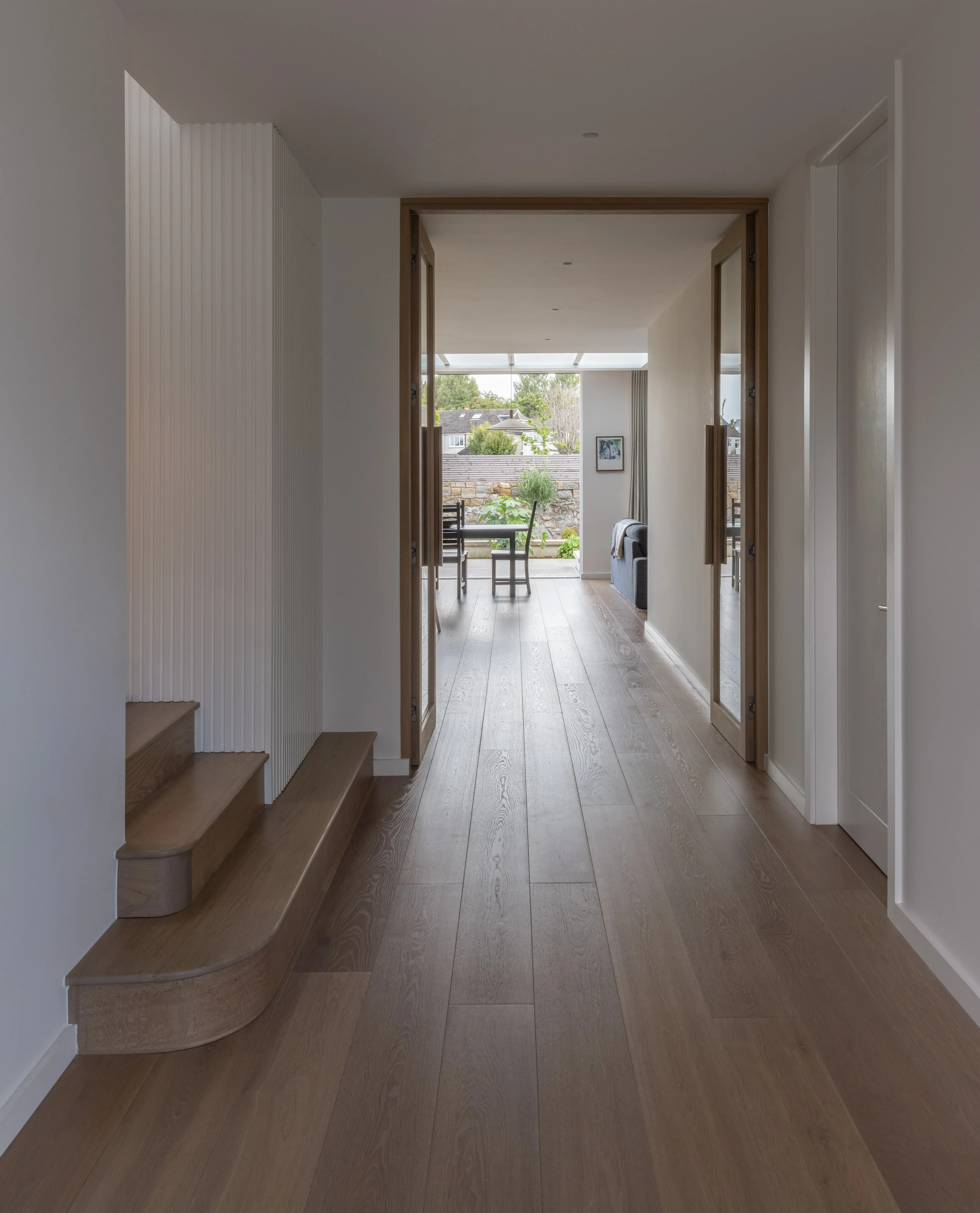 A new layout was key to this project, and the new open plan living, kitchen and dining space has a large picture window and sliding doors that look out to the terrace, garden, and park. “Internally, the plan flows from the entrance hall through a generous corridor, itself made into an architectural moment with bespoke fluted timber wall panelling, curved oak stair threads and full height timber doors,” Róisín explains. “The old stairs were relocated to allow a much more generous entrance hall with uninterrupted views through to the rear of the home and the garden beyond.”