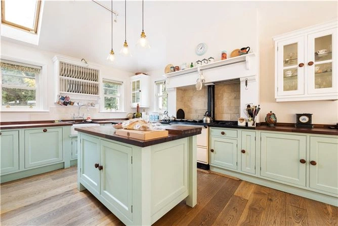 A large bay window brings light to the bespoke kitchen/dining/family room, which has ample storage courtesy of several fitted cupboards and units along with a butcher block work surface. A Belfast sink, centre island, integrated Belling electric oven, Stanley dual burner/cooker, integrated Miele dishwasher, and an American style Hotpoint fridge/freezer can also be found here.
