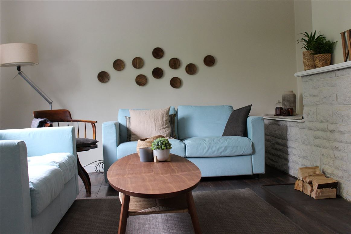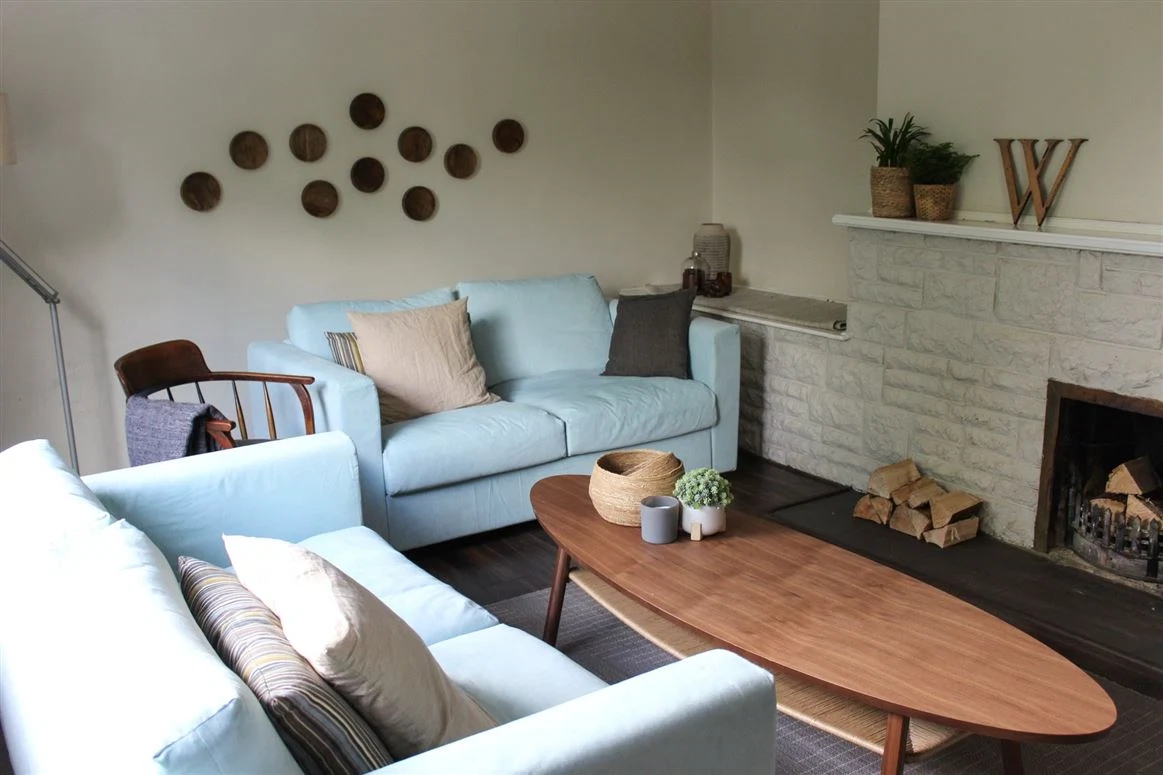 A feature open fireplace with brick surround stands proudly against one wall in the sitting room, with baby blue couches bringing colour to the area.