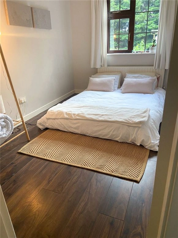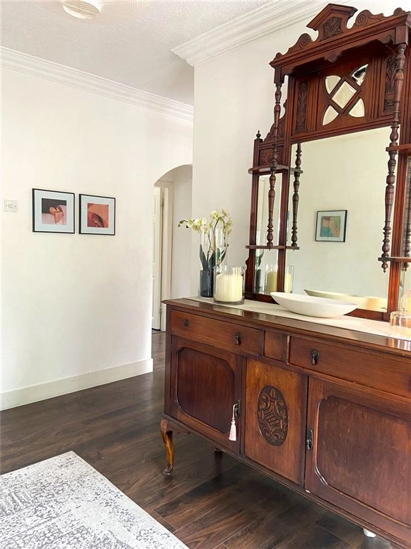 Inside, a glass sliding door leads to the landing which in turn opens onto a light-filled entrance hallway. Wooden flooring starts in this room and continues throughout many other rooms in the home – including all four bedrooms.