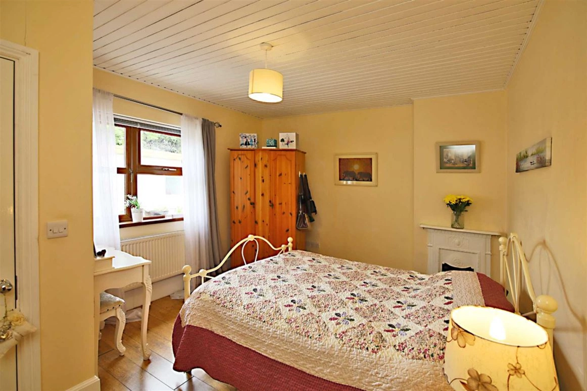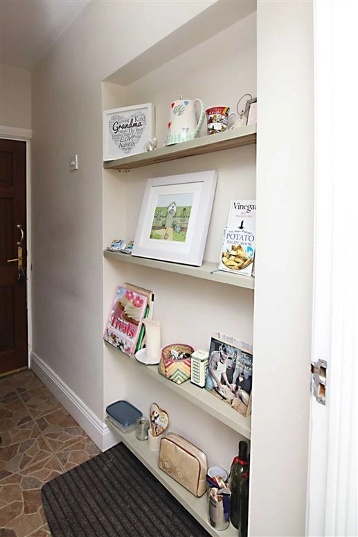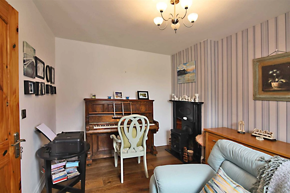 A gravel drive leads up to the front of the house, with ample off-road parking available for car owners. The front door opens onto the entrance hallway. A bedroom can be found to the left, while the living room is to the right.