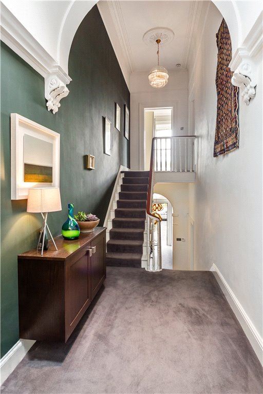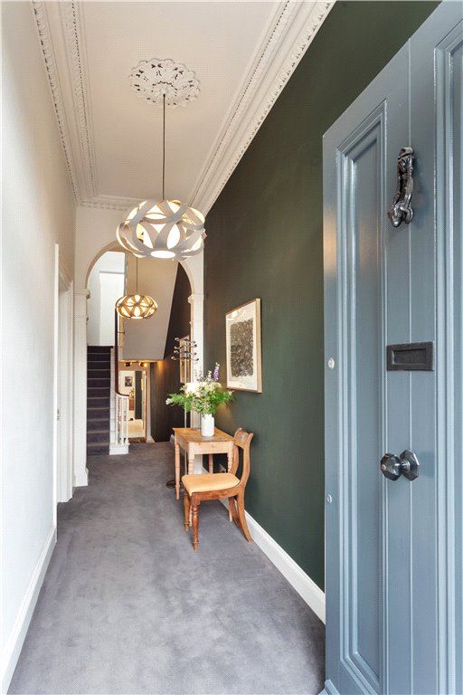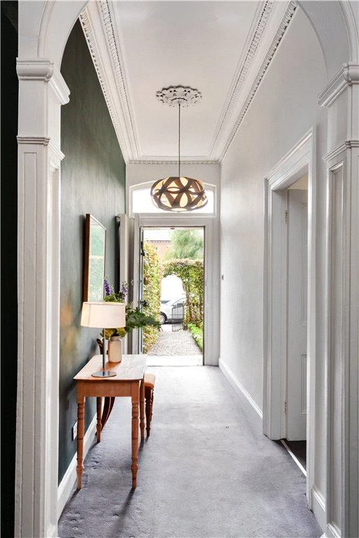 The home’s entrance hallway has a decorative arch, ceiling coving, and has been painted a deep green on one side, adding a moody touch. To the left are two interconnected reception rooms, with a sash window with shutters in each space, a grey carpet running throughout, and two wood-burning stoves.