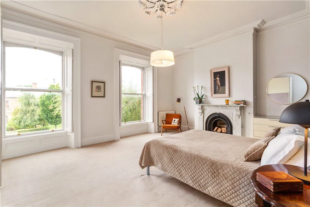 Upstairs, there are four bedrooms. The main bedroom is the full width of the house, and has two south-facing sash windows, as well as a marble fireplace.