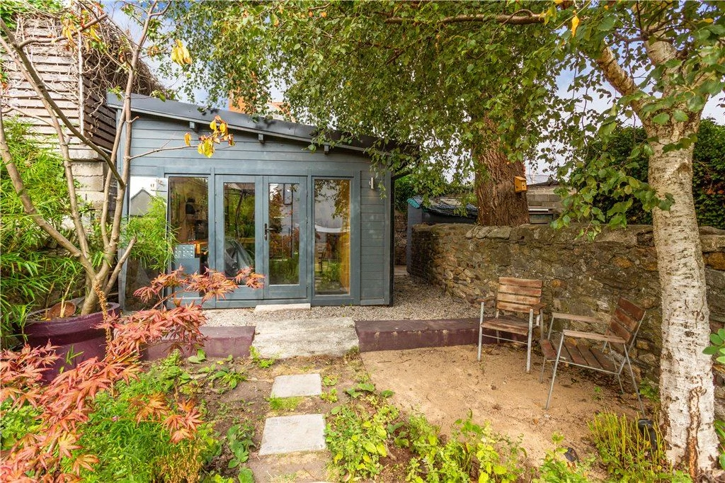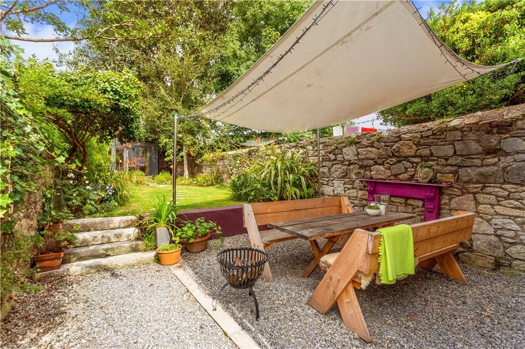 The garden is a real feature of this home. Stretching to around 25 metres, there is a covered gravel seating area, perfect for outdoor dining. Stone walls border the garden, which is mostly lawn with flower beds on either side and a path leading through it.