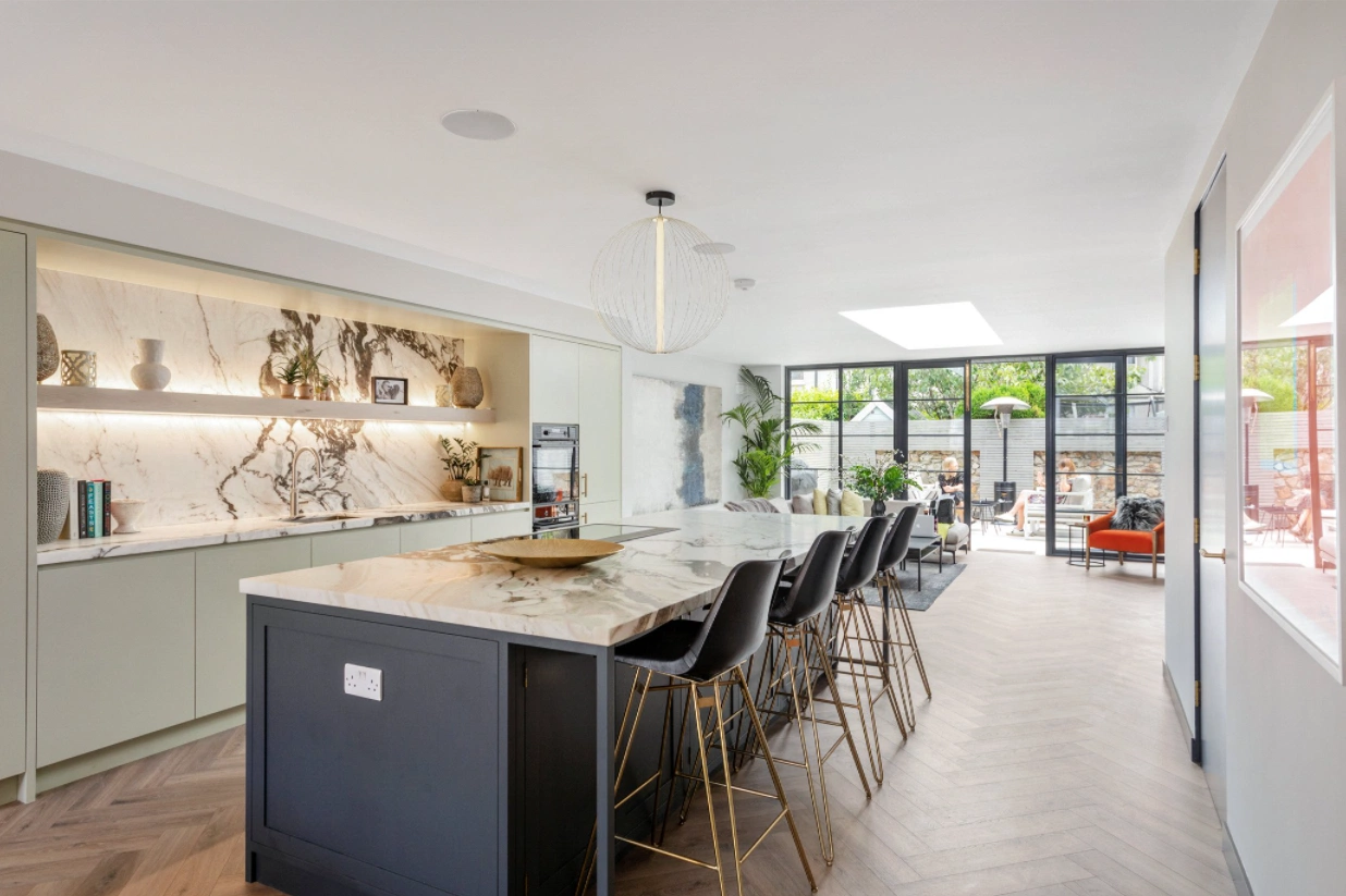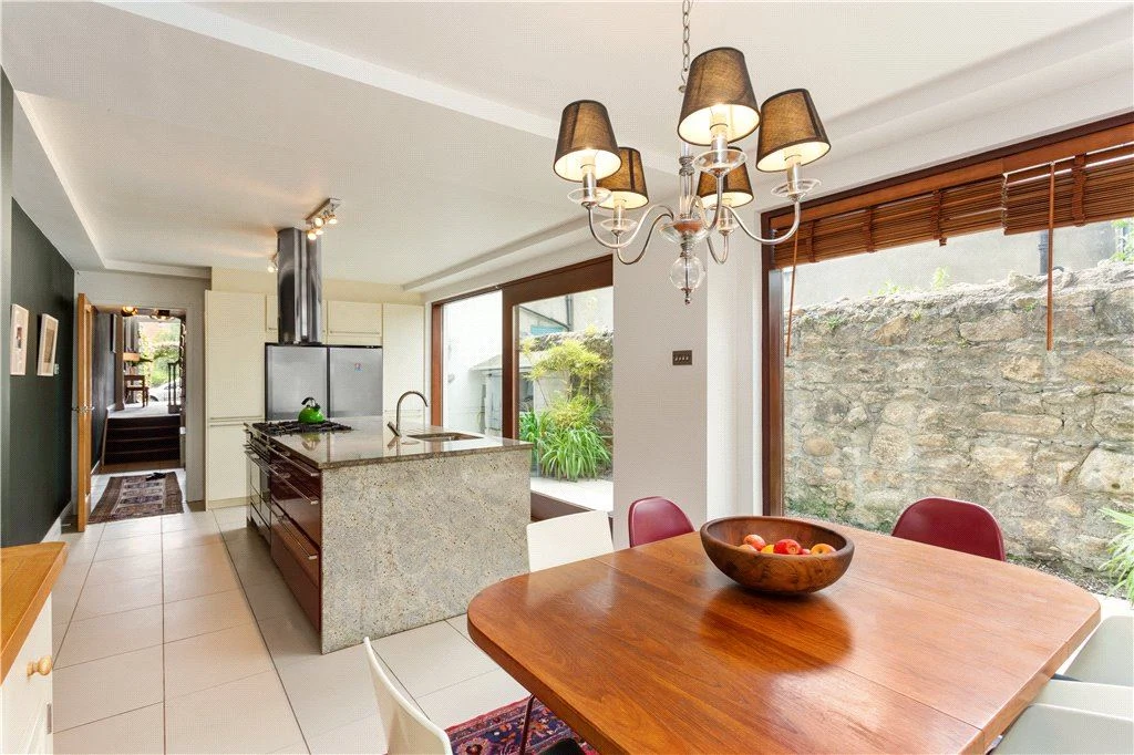 To the back of the house is the kitchen and dining room, which has two picture windows and a large door to the garden. The island has plenty of storage as well as a range cooker. There is also a utility room and a shower room on this level.
