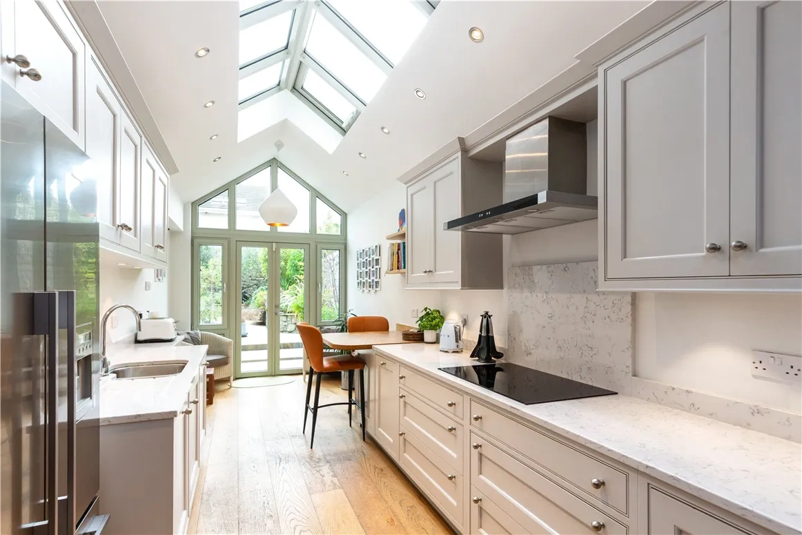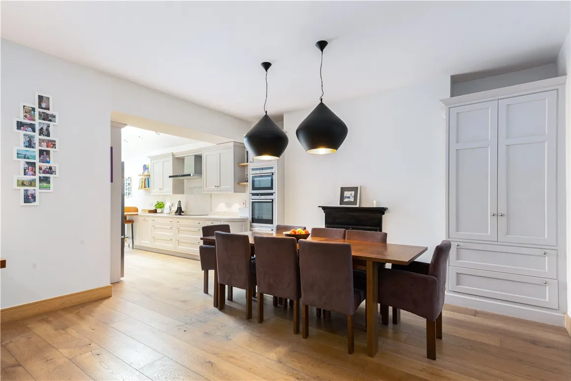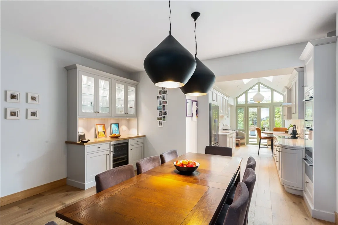 On the garden level is the kitchen and dining area. The kitchen sits within a modern extension, and has a vaulted ceiling with roof lights, wide plank oak floors, bespoke units with marble countertops, and a pantry and larder units. There are also French doors that lead out to the back garden.
