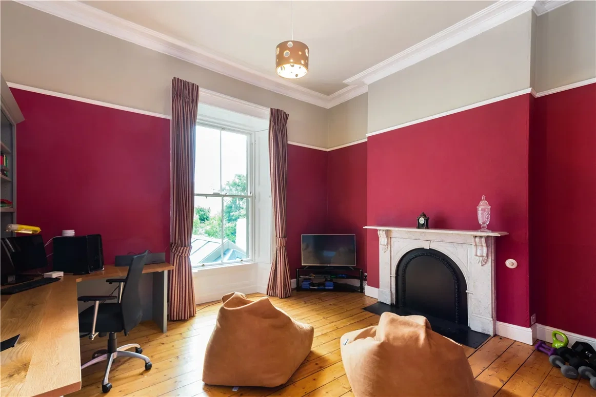 Further down the hallway is a second reception room, used by the current owners as a home office and den. It has a wooden floor, marble fireplace, and a fitted desk unit.