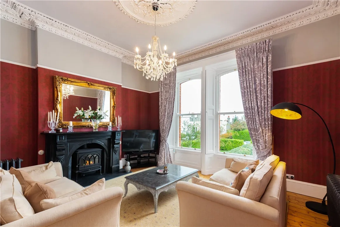 To the right of this space is the living room, which has high ceilings, intricate ceiling cornicing, two large sash windows and a black marble fireplace.