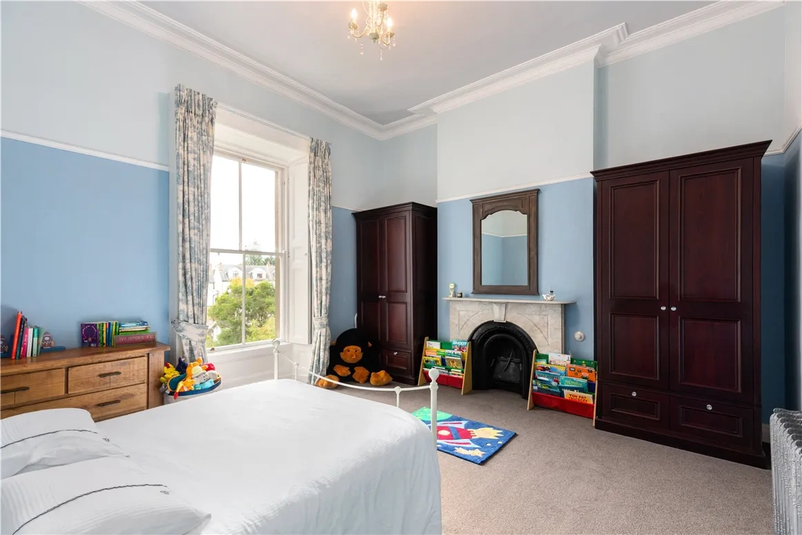 Upstairs, the main bedroom is the full width of the house, and sits to the front. It has two windows with sea views, ornate ceiling coving, a marble fireplace and fitted wardrobes. There is a second bedroom on this level, also with a marble fireplace and built-in wardrobes, as well as a bathroom.