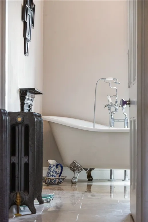 To the back of the house on this level is one of the bedrooms and a bathroom. The bedroom features built-in wardrobes and a desk unit, as well as a cast-iron fireplace.