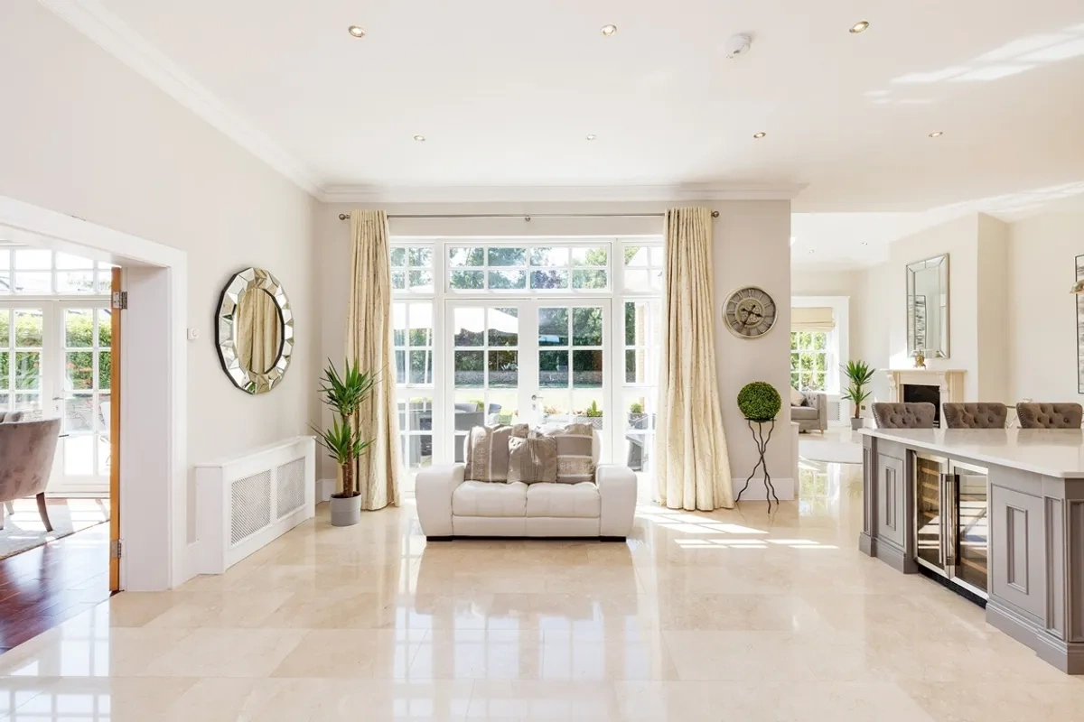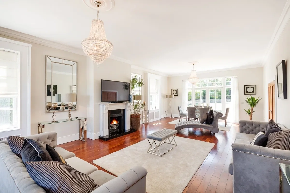 Upon arrival clients are greeted by a reception hall that boasts a bespoke walnut sweeping curved staircase and guest W/C. There is double door access to the formal lounge/dining room, which runs from front to back and there is also a separate family room to front and the large sash windows overlook the superb grounds.