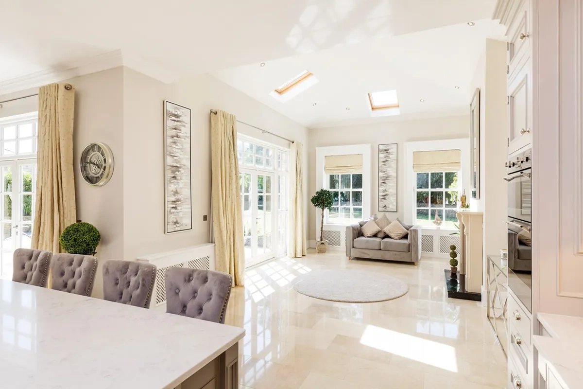 This much-loved Malahide mansion enjoys many exceptional features, including a newly installed top of the range Tierney fitted kitchen with 10 meter high walnut units that are hand painted in Farrow & Ball with a fully integrated over cornice and under pelmet lighting system.