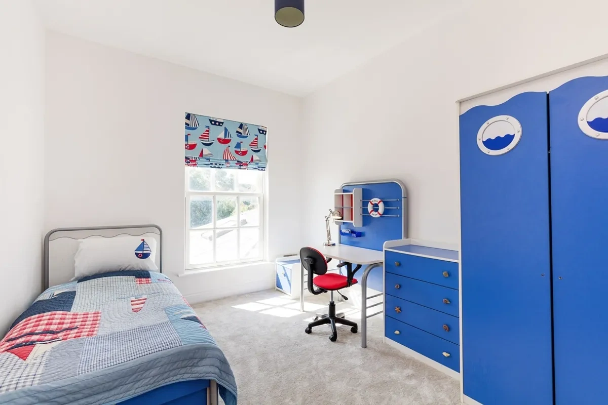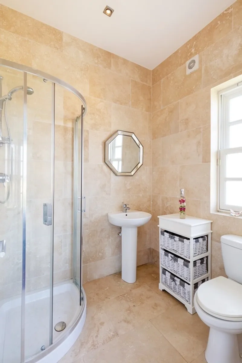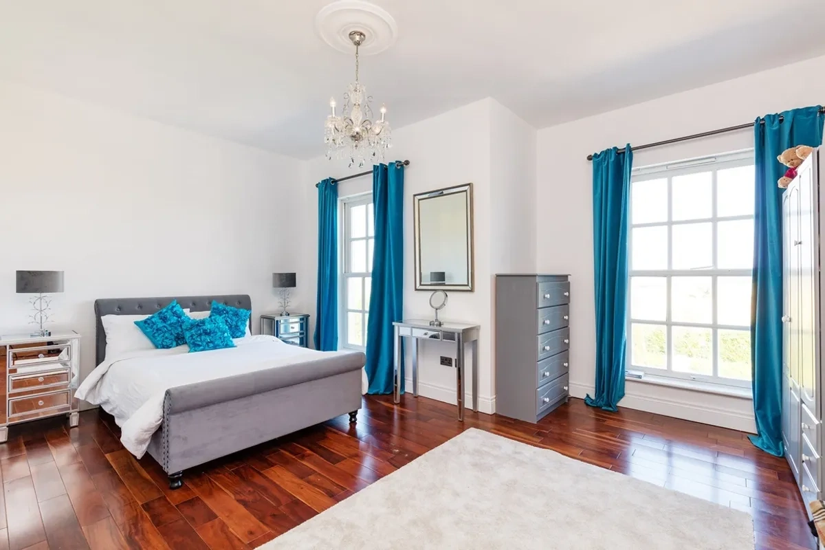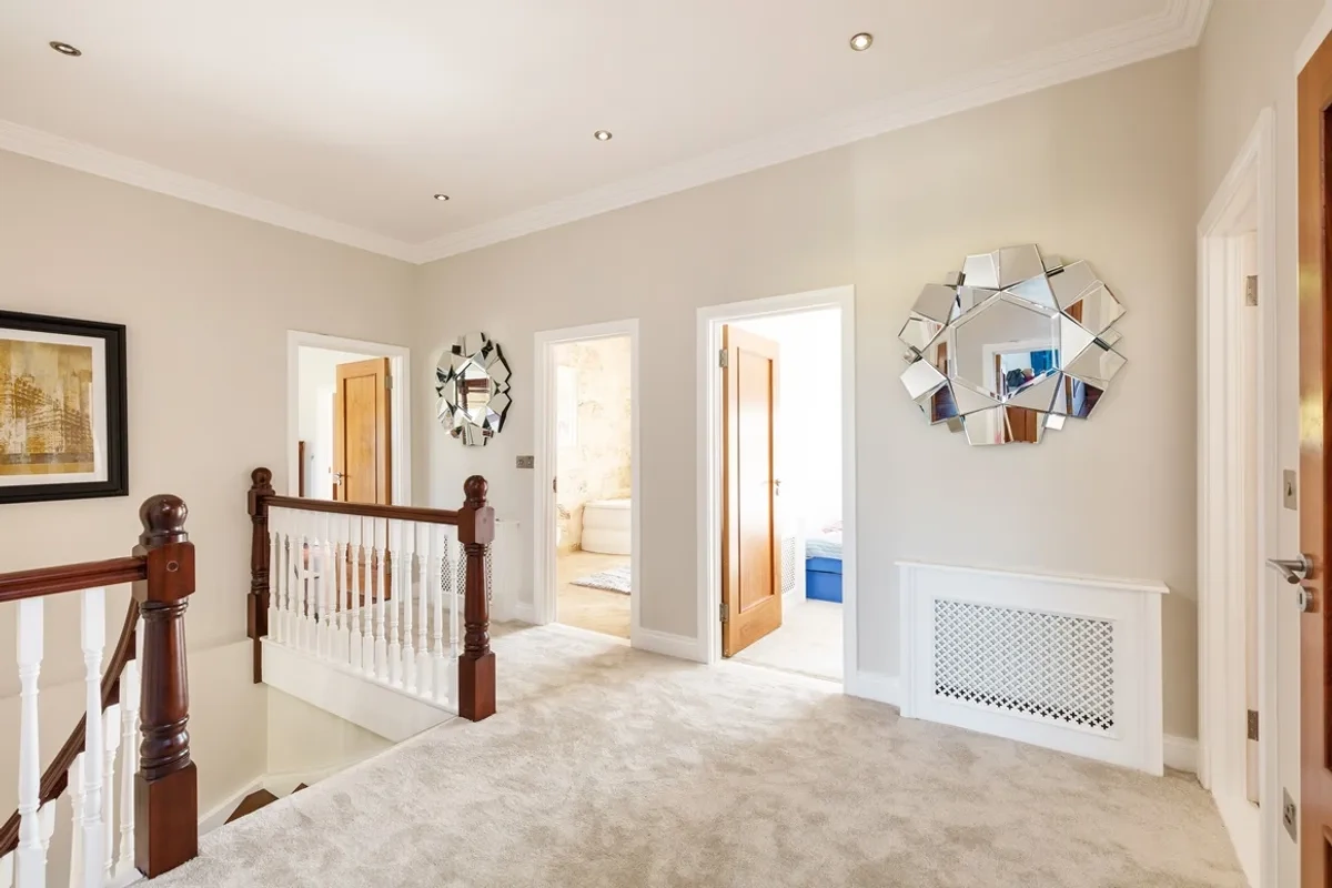Upstairs, there are five spacious bedrooms at first floor level including a magnificent master suite with dressing room and en suite. The guest bedroom with en suite is located to the front of the property, and all three front bedrooms enjoy views across the countryside towards Malahide village and Howth Peninsula.