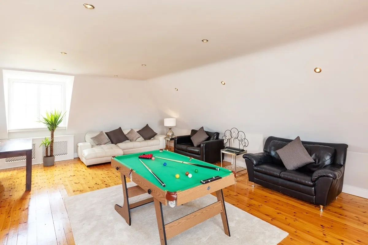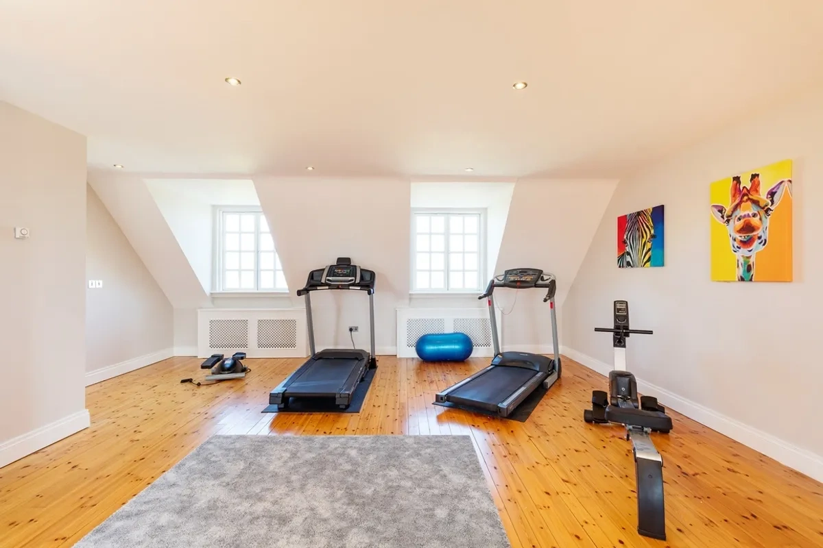 On the top floor, there is an excellent games room as well as a large gym with eaves storage and a boiler room. The gardens — which extend to about 33 acres — are a truly outstanding feature, and the front garden with its impressive entrance gates and cobblelock driveway provides parking for at least five cars.